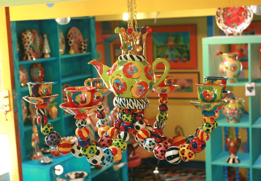 Six Armed Teaset Chandelier Gold New Rose Black Dot