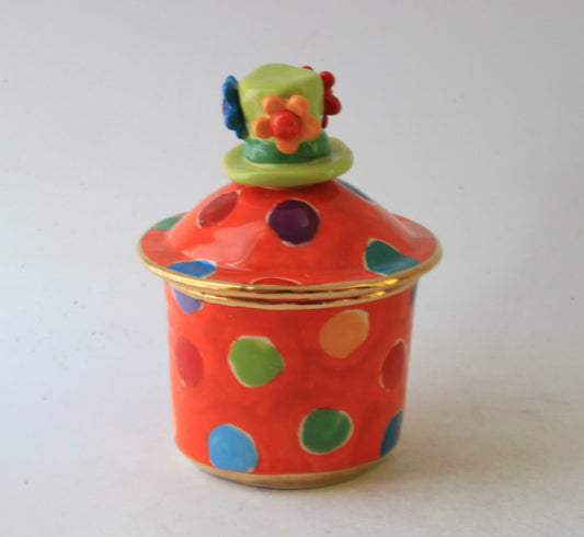 Tiny Lidded Pot with Hat Handle Orange with Dots