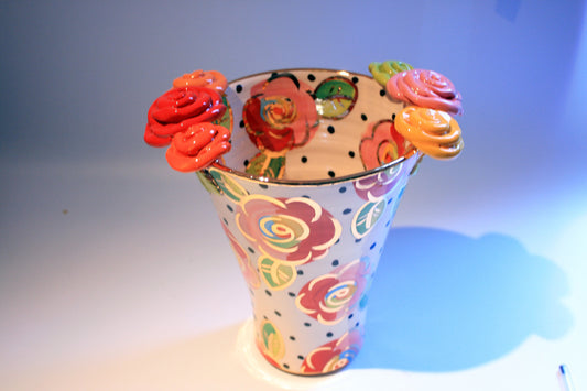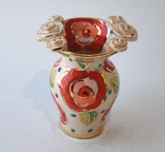 Tiny Rose Edged Vase Tangerine Roses on Dots