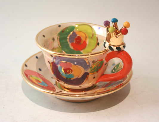 Crown Handled Cup and Saucer in Gold New Rose on Black Dot