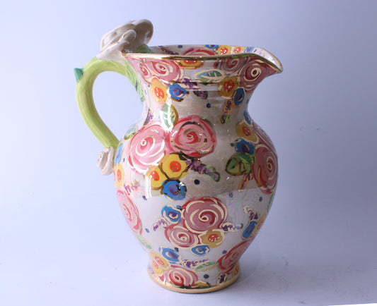 Large Rose Handled Jug in Gold New Rose on Iridescent Pink