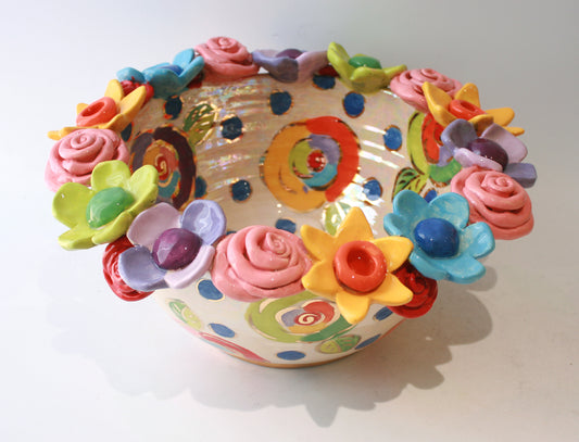 Large Multiflower Encrusted Bowl Gold New Rose Black Dot