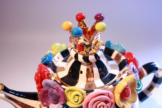 Multiflower Encrusted Crown Lidded Teapot Black and Gold and White Stripes