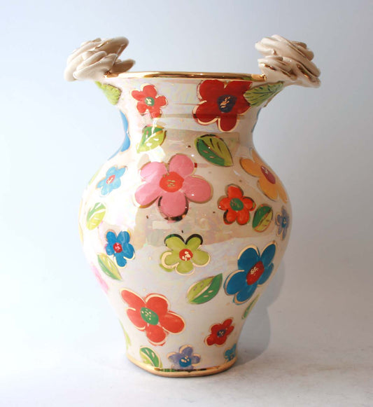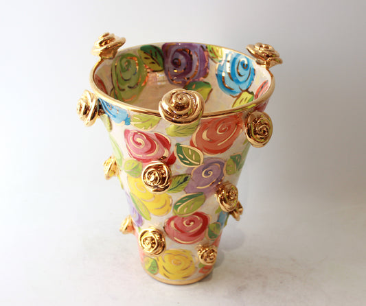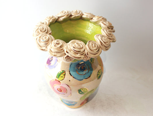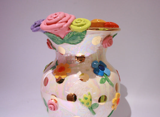 Large Fat Rose Encrusted Vase in Mixed Pale Roses