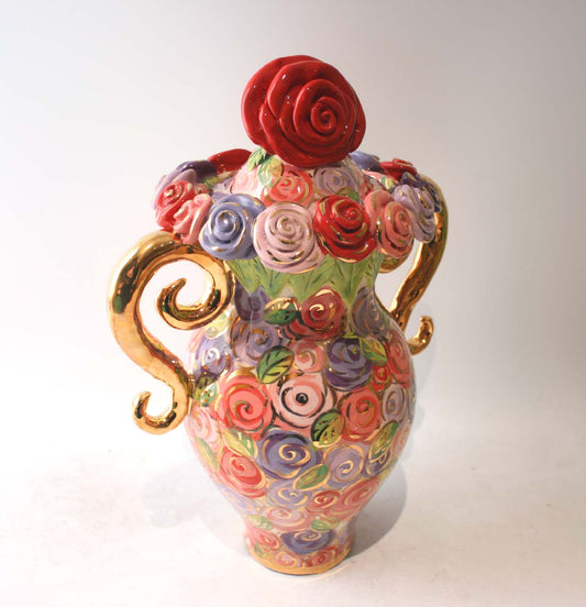Giant Encrusted Lidded Vase in Dusky Pink Roses