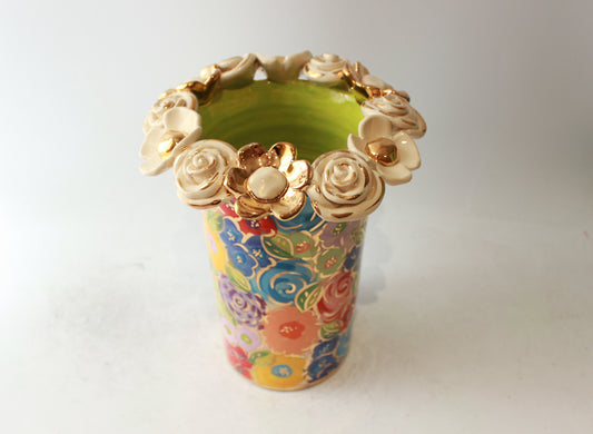 Small Multiflower Encrusted Cylinder Vase in Pastel Blooms