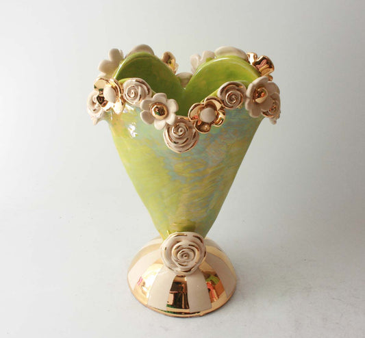 Medium Multiflower Encrusted Heart Vase in Iridescent Green