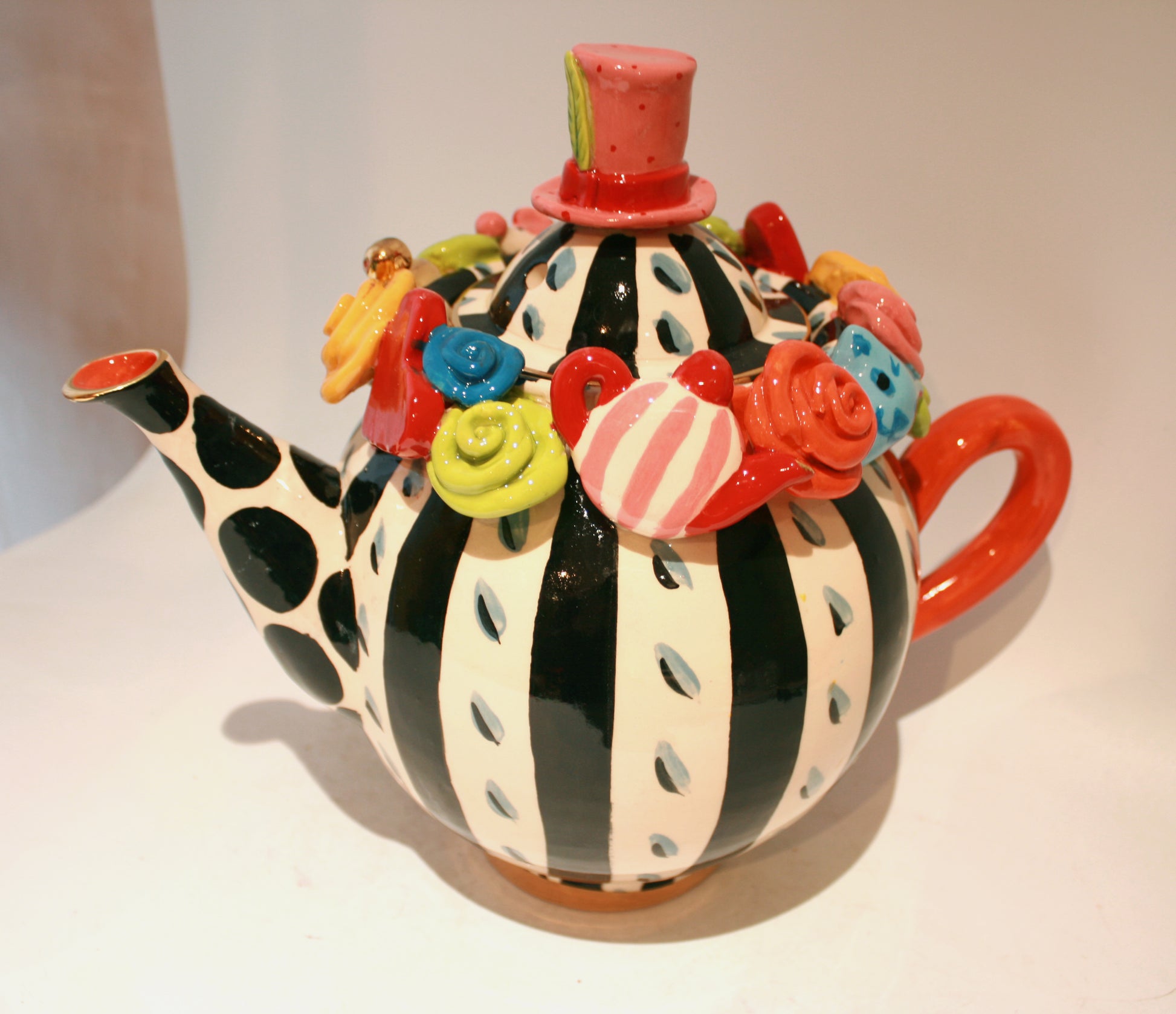 Mary Rose was inspired by all things "Wonderland" when creating this teapot...it is painted largely in black and white, but has various little ceramic creations around its lid such as a mouse, a teapot and a heart which all featured on previous versions...but now an intricate ceramic clock face also takes pride of place here! It can hold 4-6 cups of tea, so is perfect for all your Lewis Carroll themed parties and the crowning glory is no doubt the "Mad Hatter's" ceramic Top Hat atop its lid!
