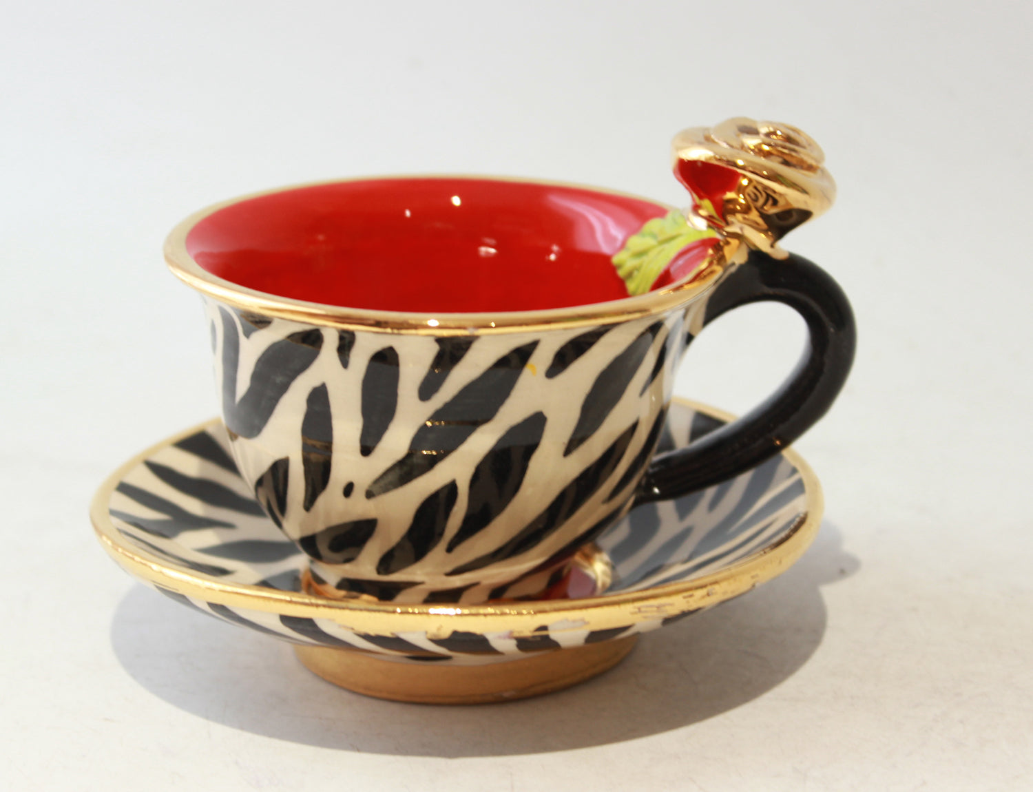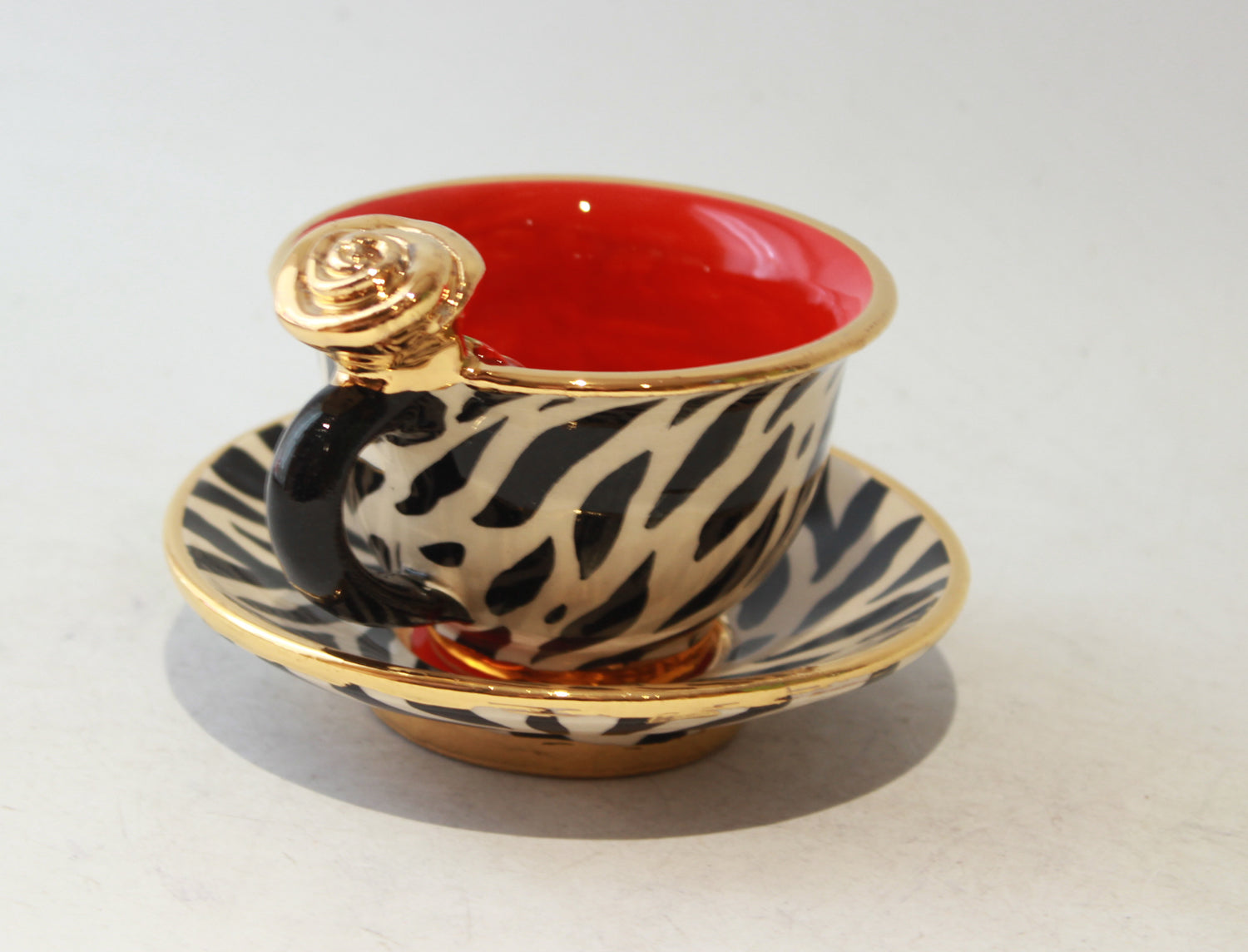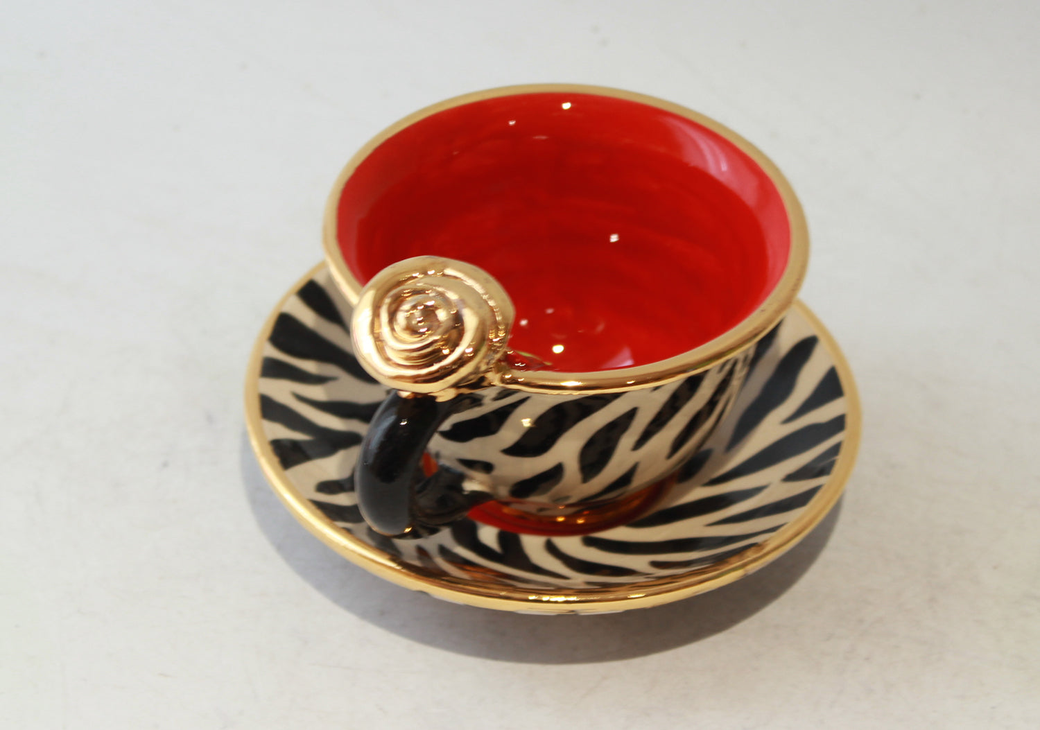 It's a little coffee cup and saucer, not really suitable for the big milky coffee drinkers but more for the sipping exquisite black coffee experts. The cup is 3 inches diameter. The rim sparkles with its rich coating of gold and the stark black and white design contrasts magnificently with the red interior