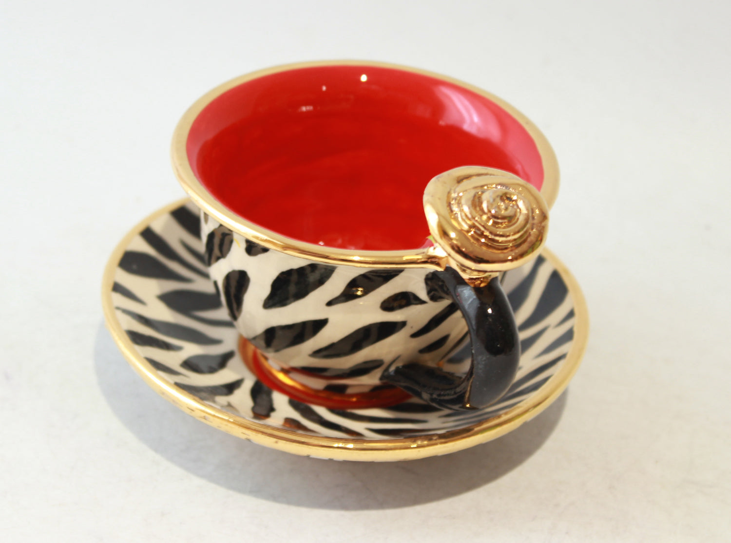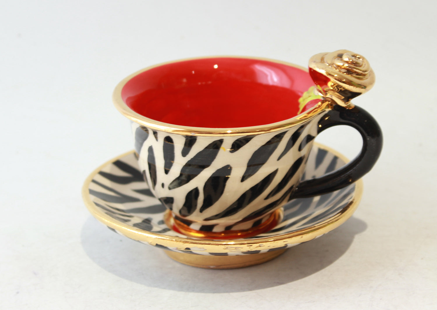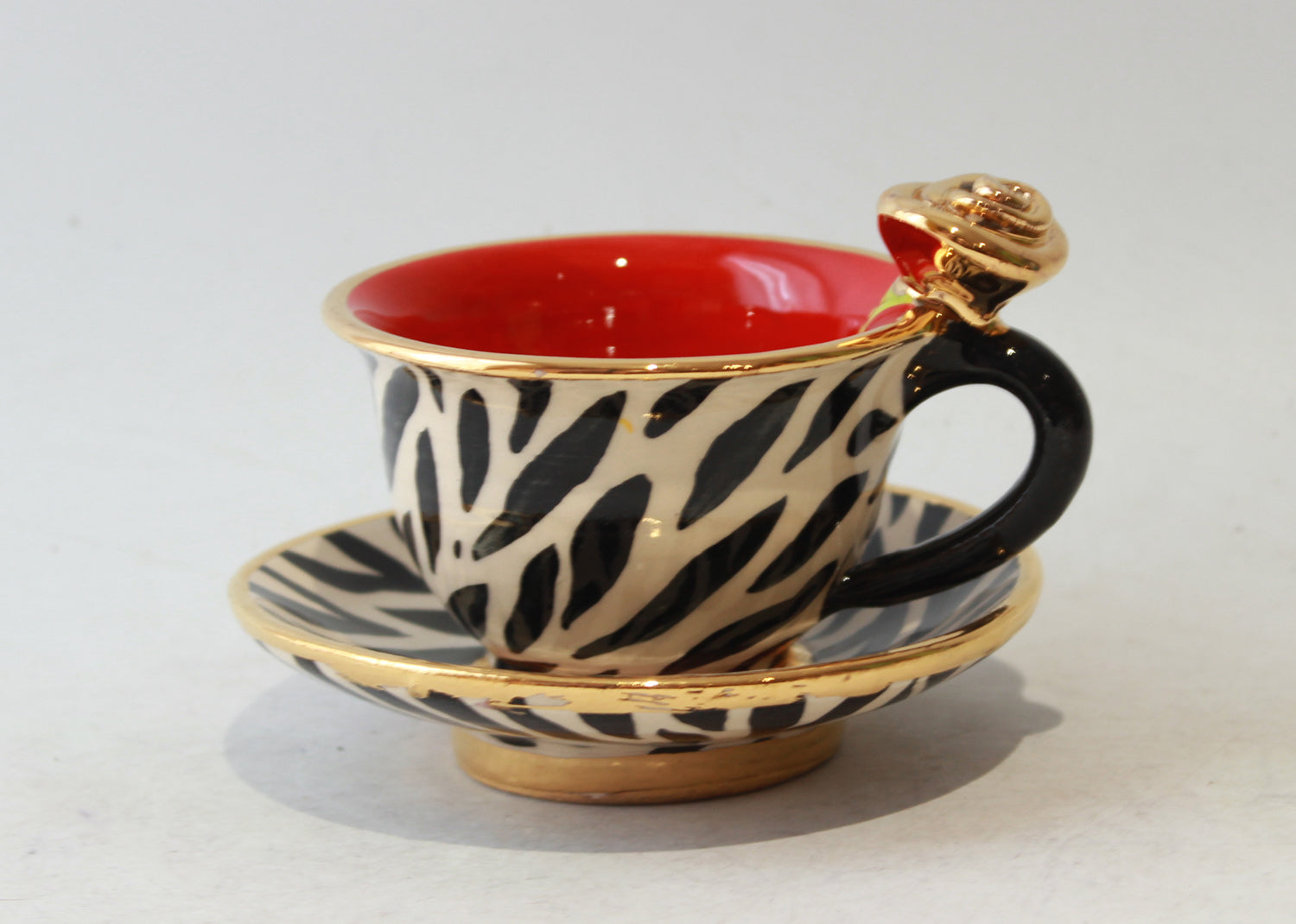 It's a little coffee cup and saucer, not really suitable for the big milky coffee drinkers but more for the sipping exquisite black coffee experts. The cup is 3 inches diameter. The rim sparkles with its rich coating of gold and the stark black and white design contrasts magnificently with the red interior