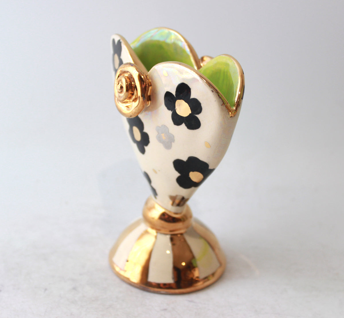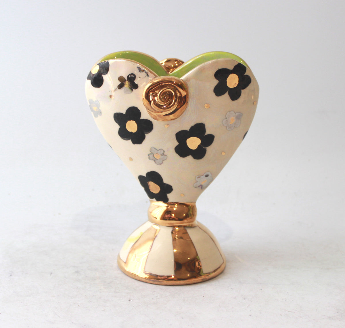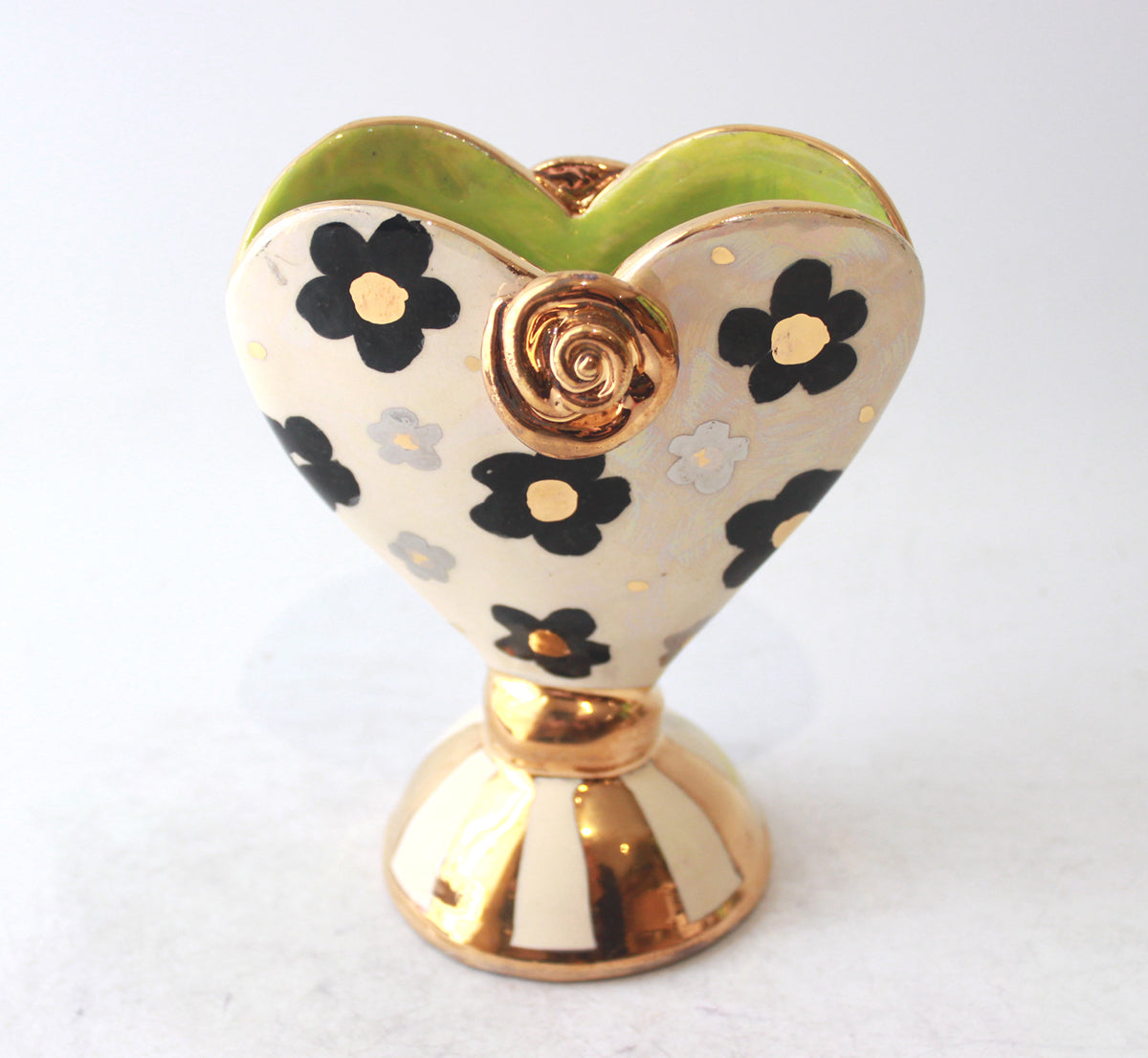 This Baby Heart Vase stands around 5 inches tall, and showcases a new Mary Rose Young design "Black and White Daisy", which features Black Daisies on an iridescent Mother of Pearl background with accents of silver and 24 carat gold! The base is gold and white stripes, and a ceramic gold rose is decoratively placed in its centre...