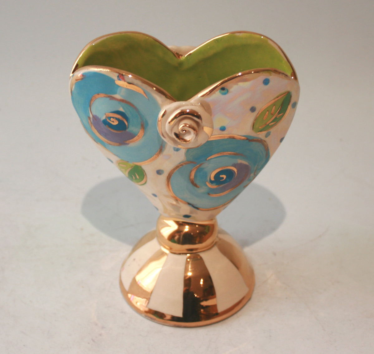 Mary Rose's Baby Heart Vases stand around 5 inches tall, and this one displays the very beautiful "Gold New Rose" on a background of blue polka dots! The base is gold and white stripes to match the accents of 24 carat gold throughout, and there is a little ceramic rose in the centre just for good measure!