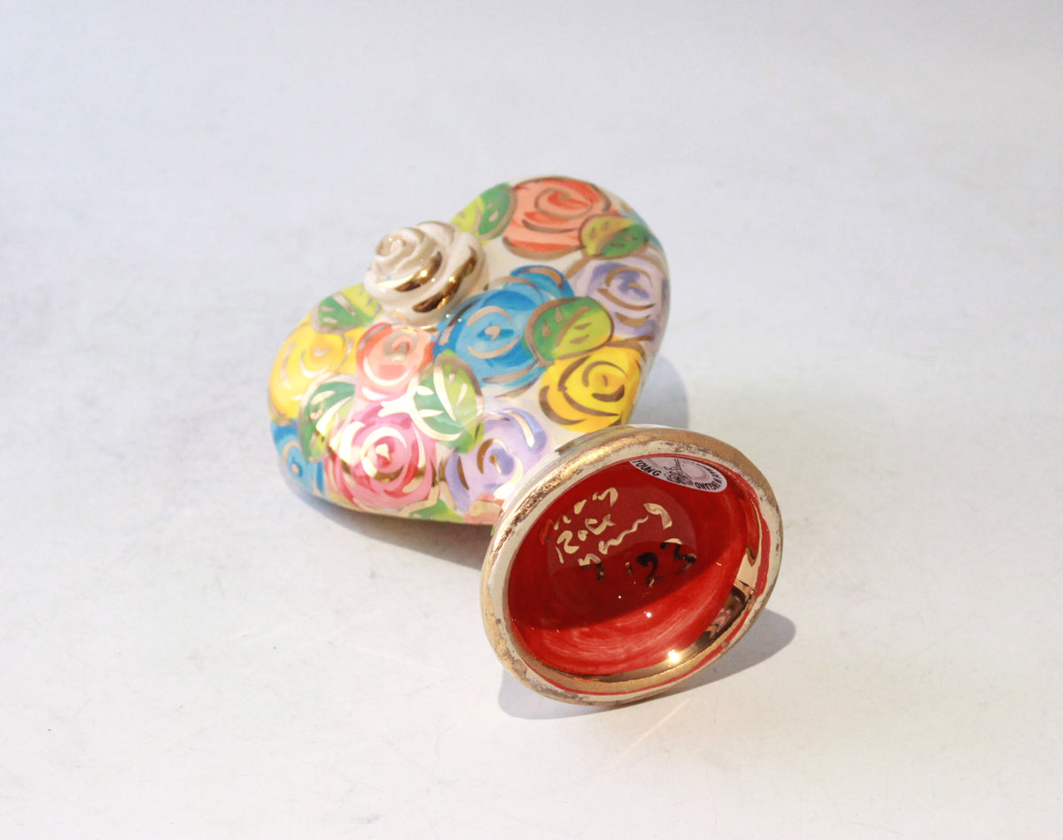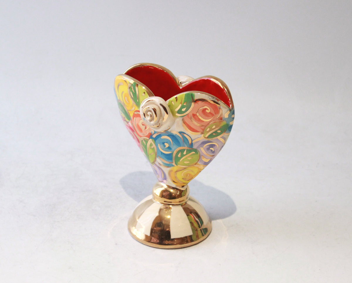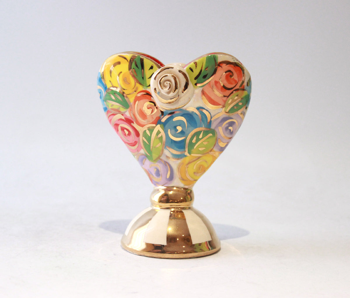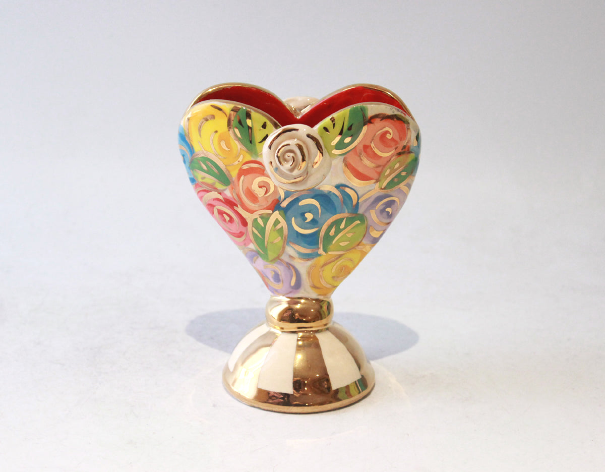 Mary Rose's Baby Heart Vases stand around 5 inches tall and are full of all of the whimsical charm that defines her work...this one is painted in a rather fun variation upon her "Rosebush" design, where blooms of all the colours of the rainbow compete for space bordered by accents of 24 carat gold!
