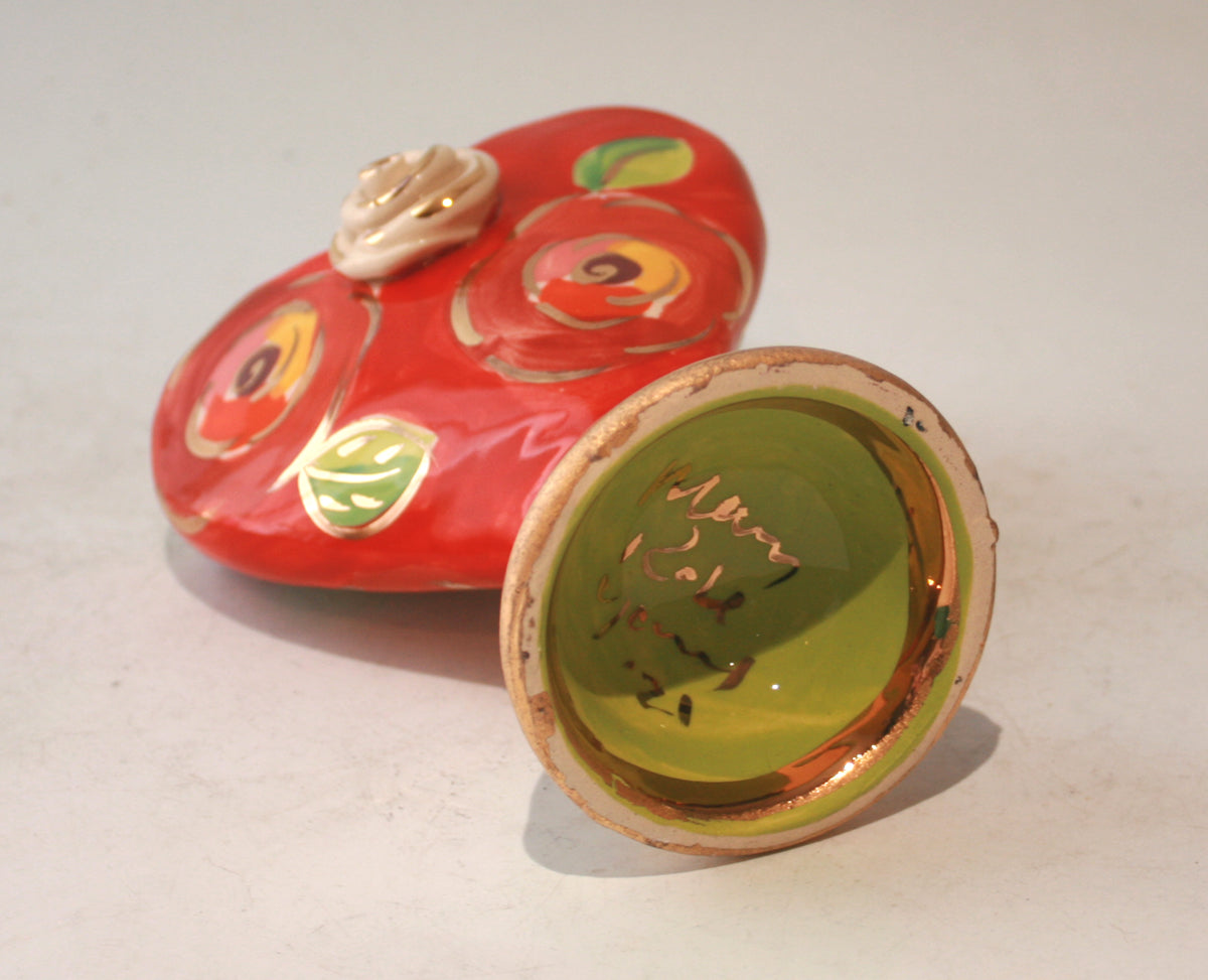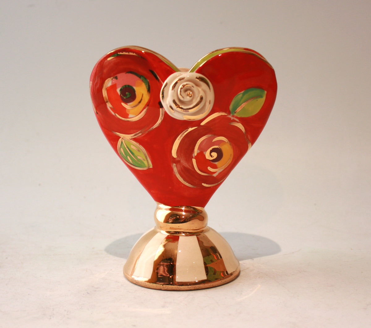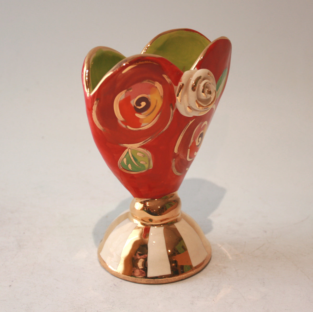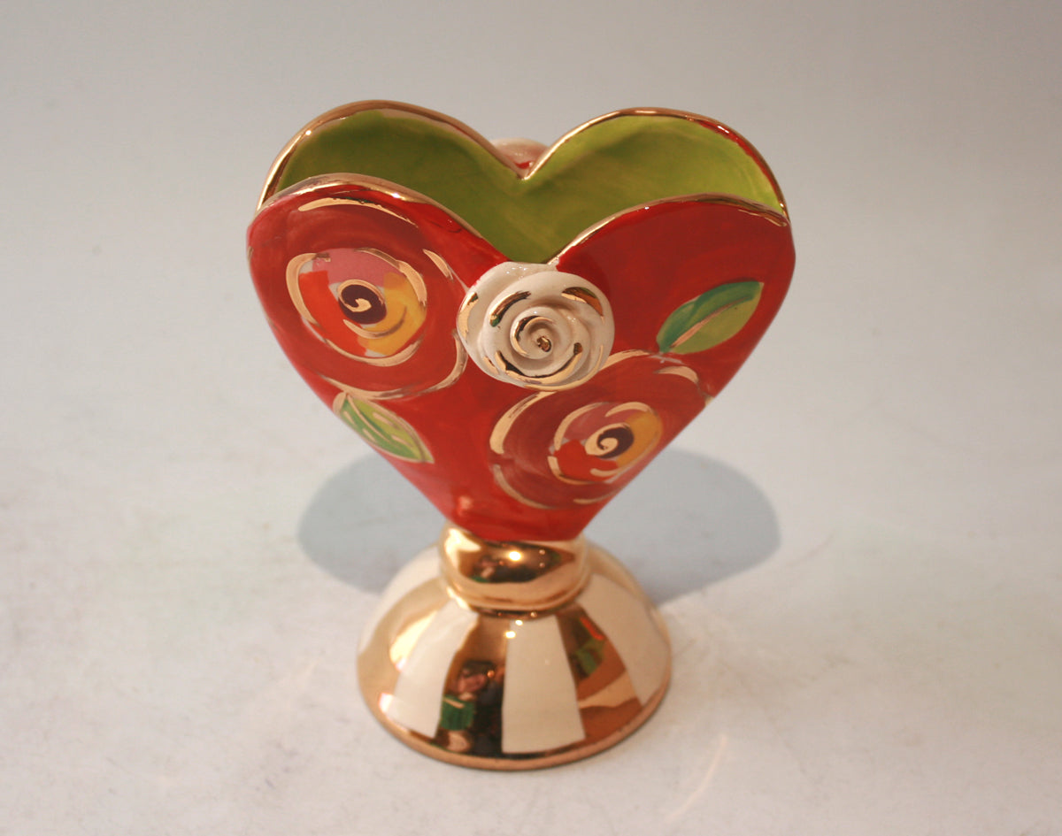 Mary Rose's Baby Heart Vases stand around 5 inches tall, and this one is painted in "New Red New Rose", an explosion of red that is sure to catch the eye atop your mantle...accents of 24 carat gold intersect the red roses and the green leaves match the green inside!