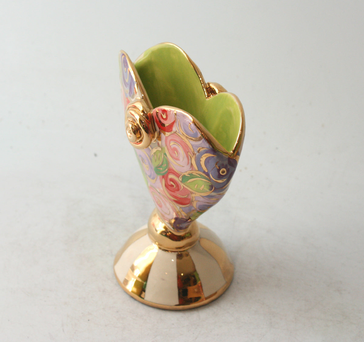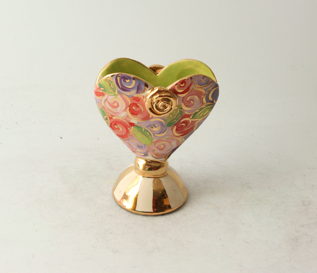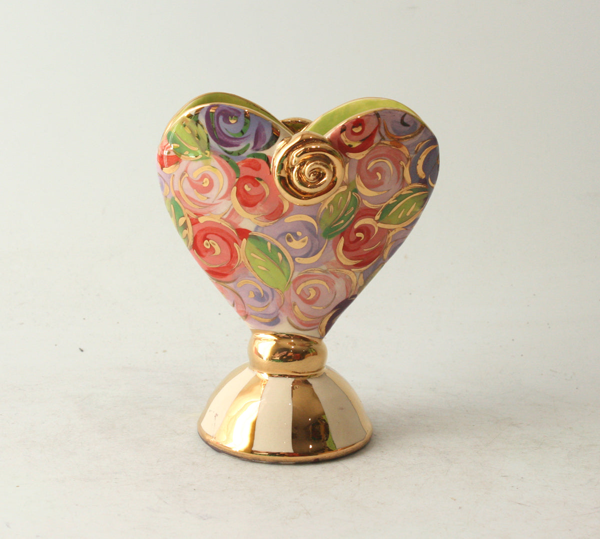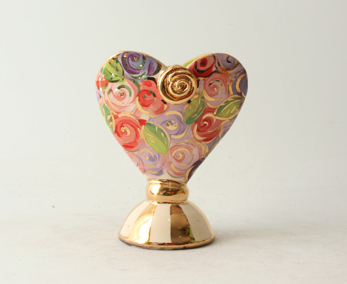 Mary Rose's Baby Heart Vases stand around 5 inches tall, and this one showcases the pretty "Pink Rosebush" design with accents of 24 carat gold and a matching gold and white striped base!