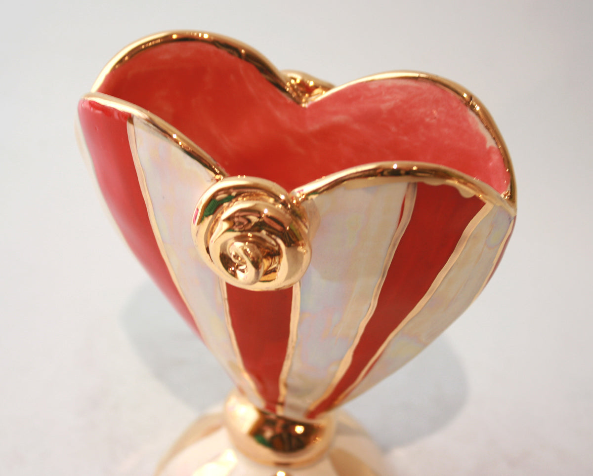 Mary Rose's Baby Heart Vases measure around 5 inches tall, this one is decorated in "Red and White Stripes" which are bordered by accents of 24 carat gold...the base contrasts in gold and white stripes, and of course the little ceramic rose matches perfectly in gold....