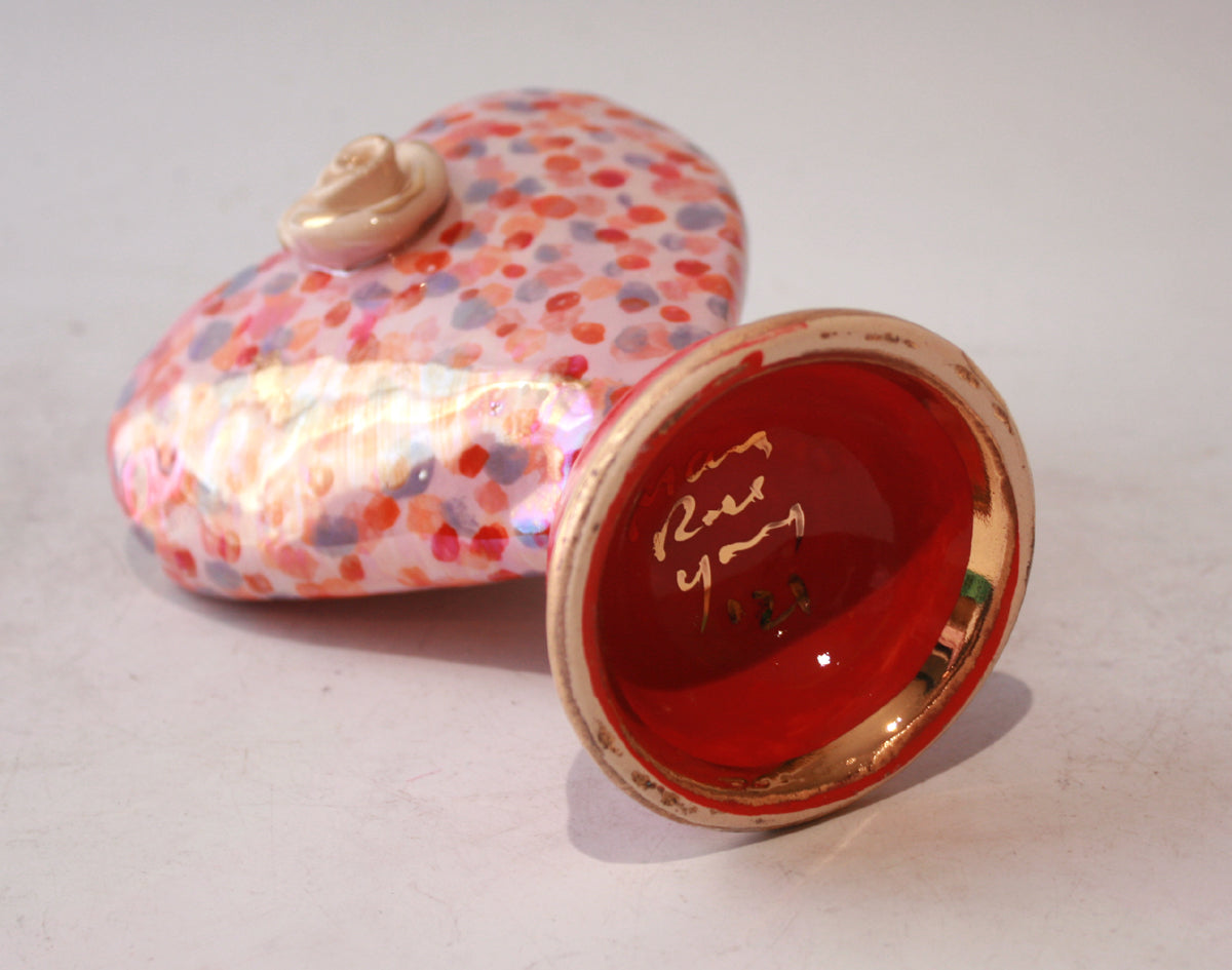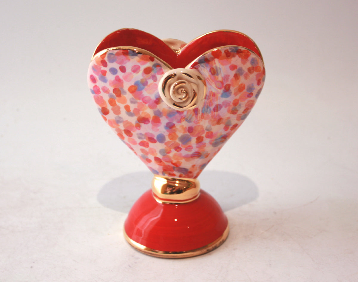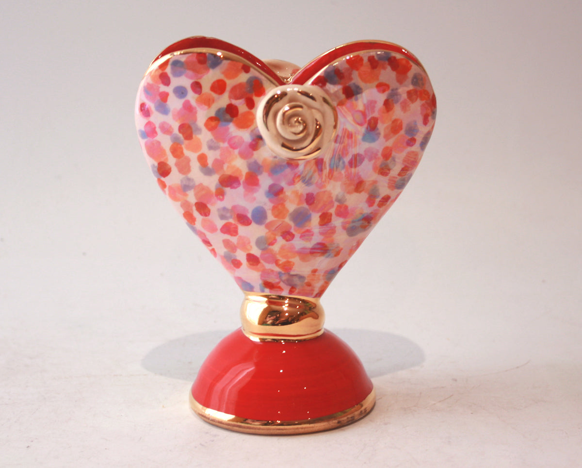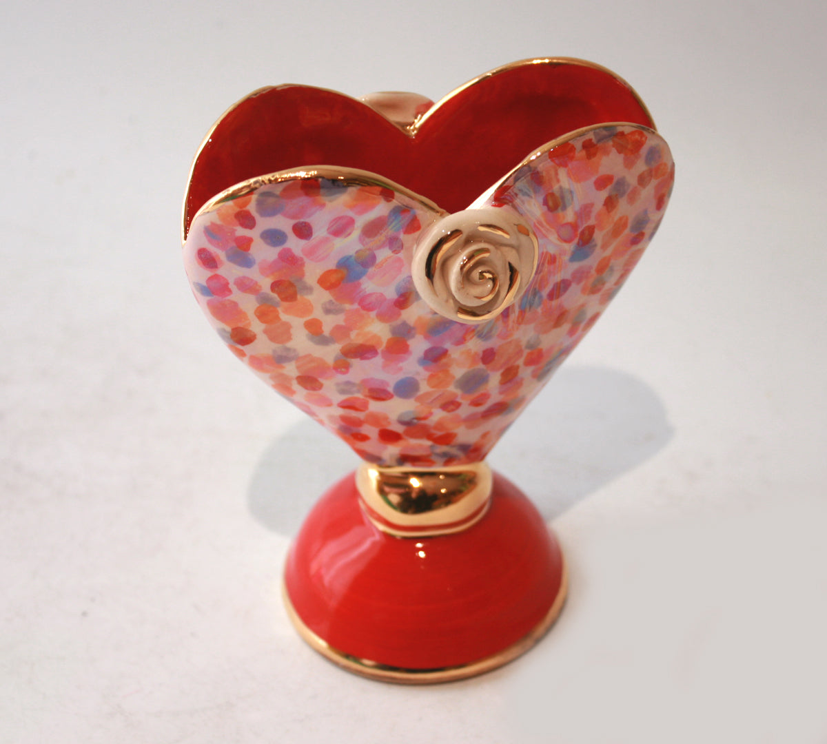 Mary Rose's Baby Heart Vases stand around 5 inches tall, and this one is painted in "Red Confetti" with a matching red base and accents of 24 carat gold...