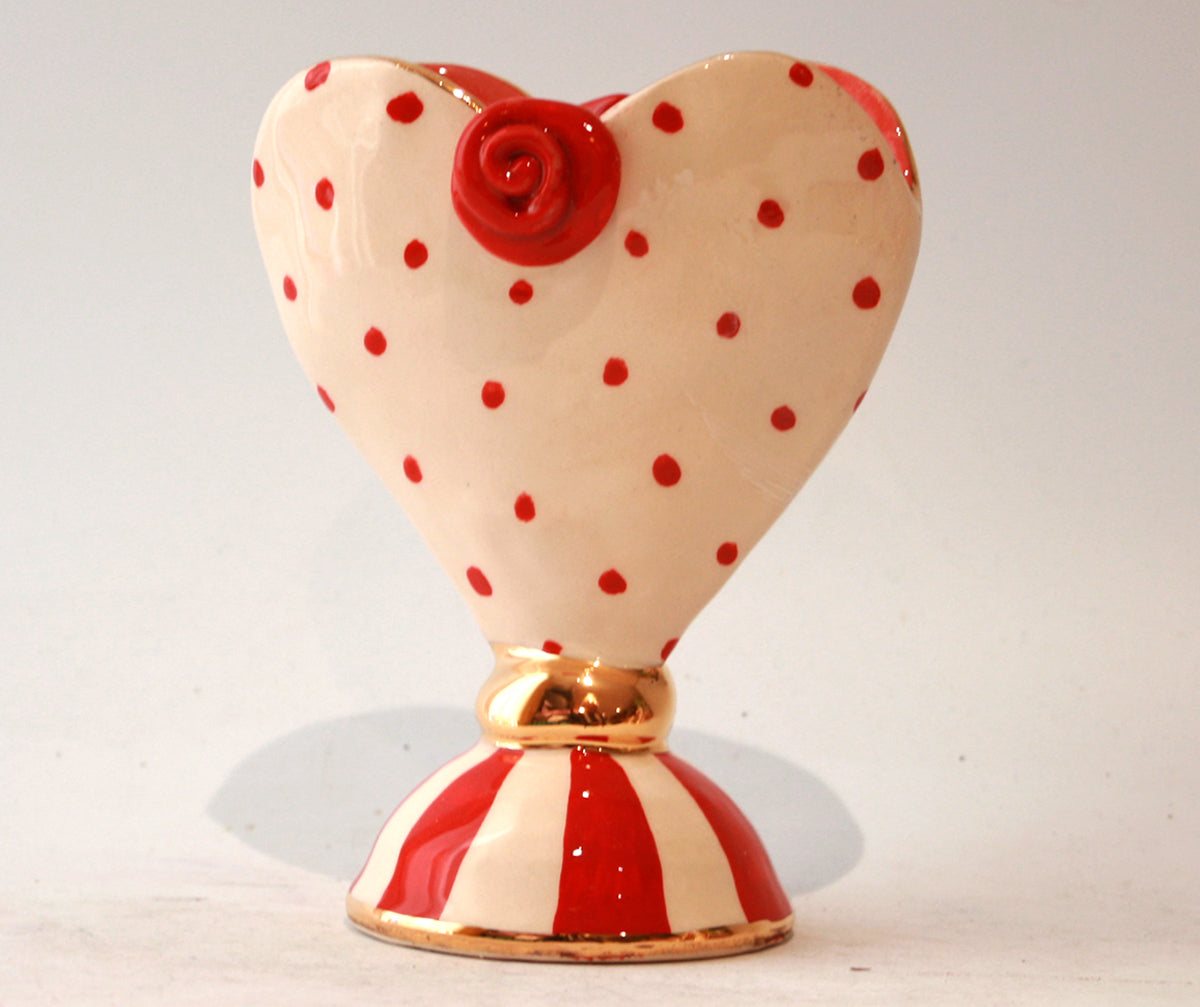 Mary Rose's Baby Heart Vases stand around 5 inches tall, and this one is decorated in "Red Polka" with a matching red and white striped base and pink inside...the piece is finally completed with a single red ceramic rose in its centre