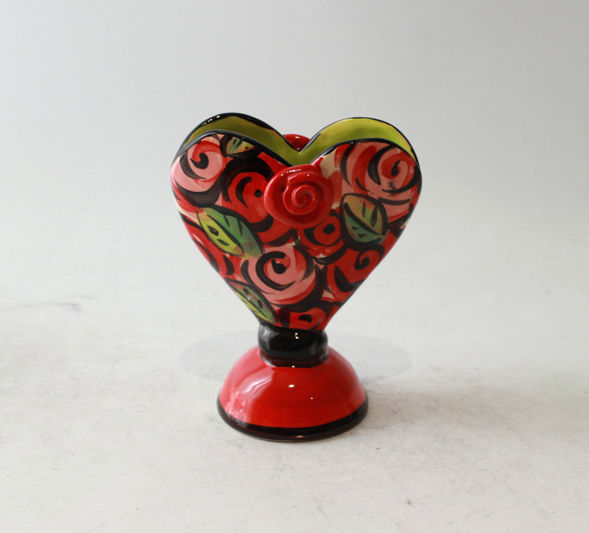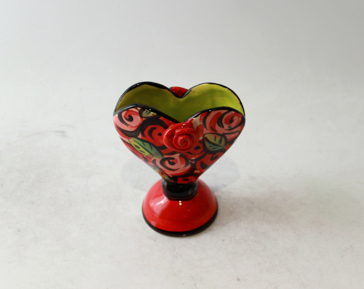 Mary Rose's Baby Heart Vases stand around 5 inches tall and are full of all of the whimsical charm that defines her work...this one is looking rather different painted in "Red Rosebush", with instead of gold - accents of stark black which contrast beautifully with the intricately deep red design and bright green inside...