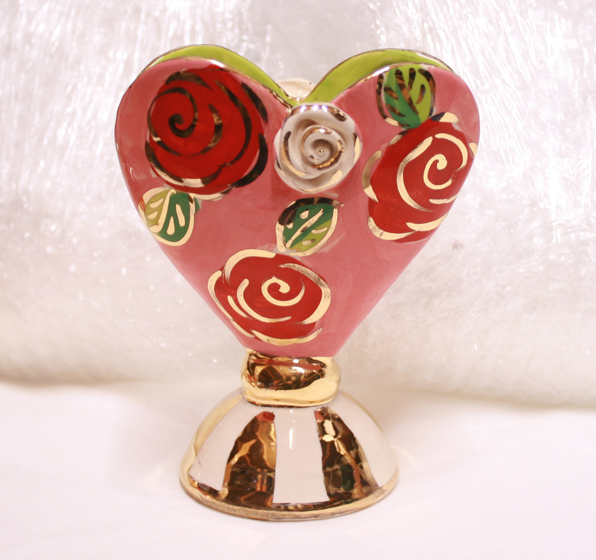 Mary Rose's Baby Heart Vases stand around 5 inches tall and this one is painted in a rather new design "Rose Red", which features gold and red roses on a pretty pink background...the base is gold and white striped, and of course the piece features a ceramic rose in the centre!