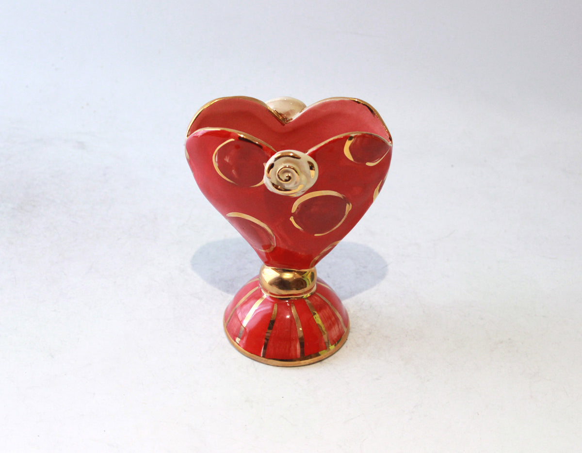 Mary Rose's Baby Heart Vases stand around 5 inches tall, and make adorable vessels for beautiful flowers or indeed just fabulous display pieces..This very eye-catching edition is painted in "Royal Red", with dots of 24 carat gold and a little ceramic daisy in its centre!