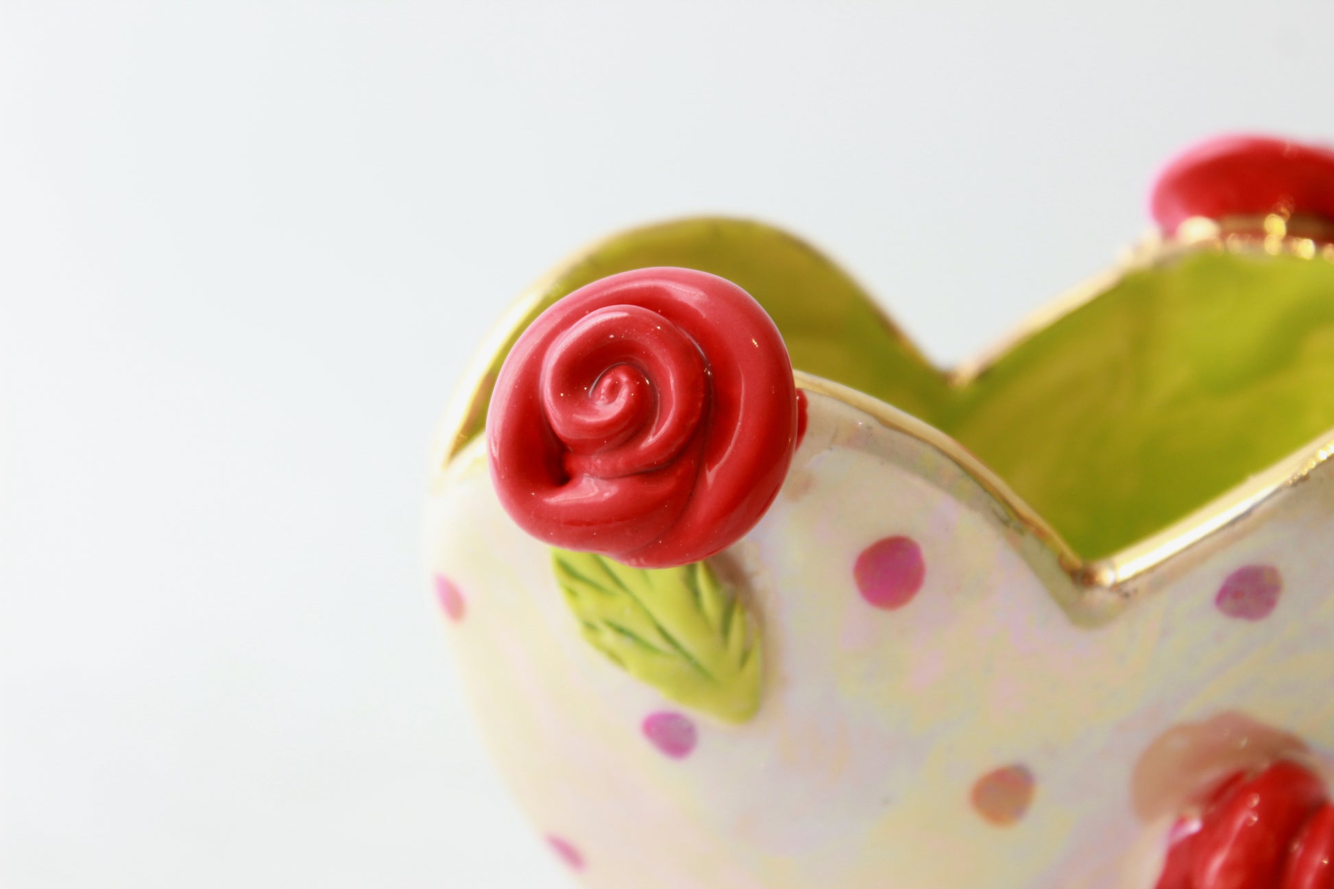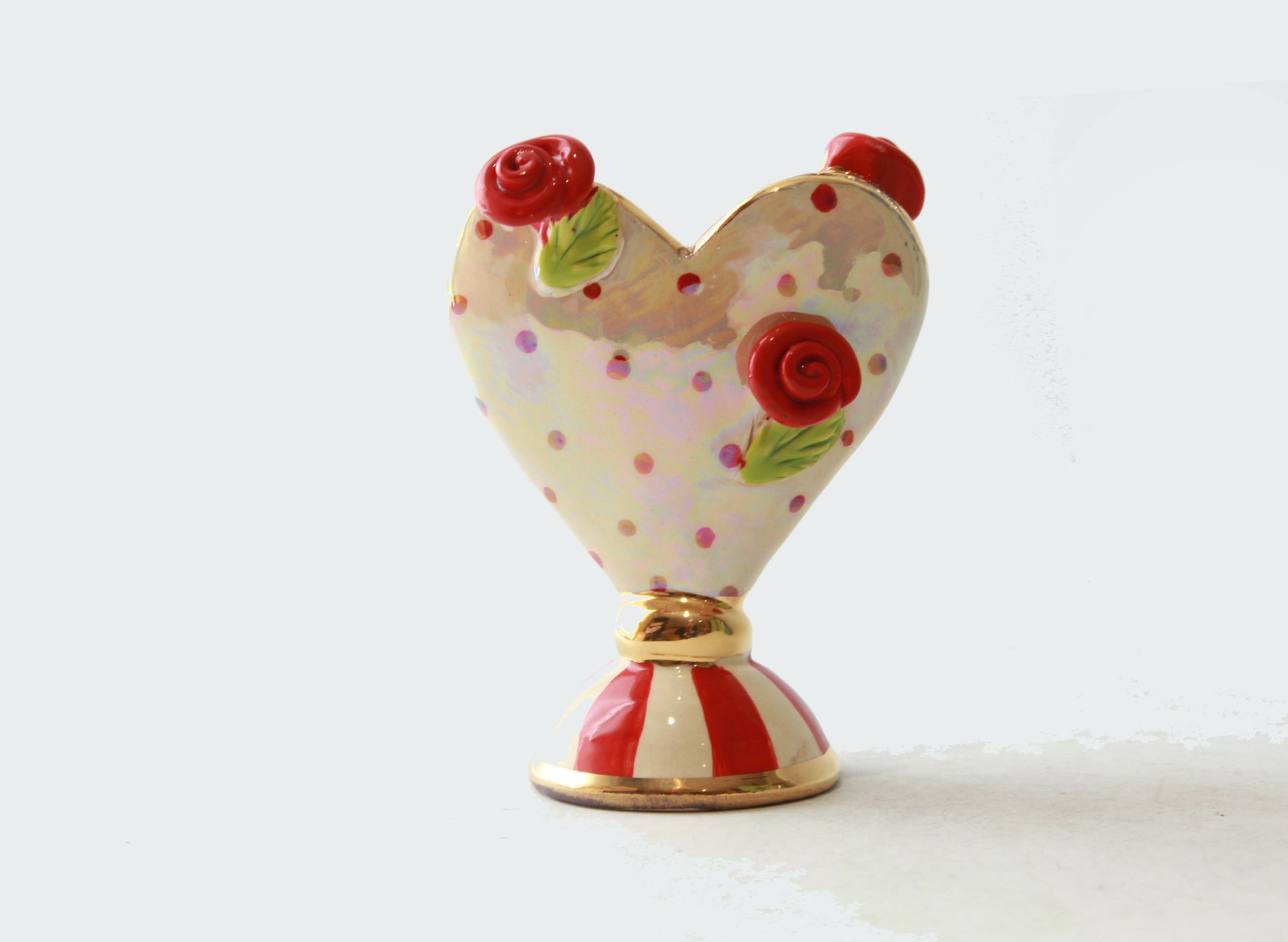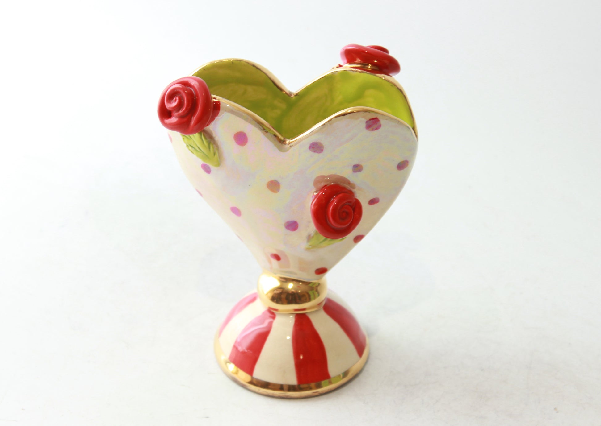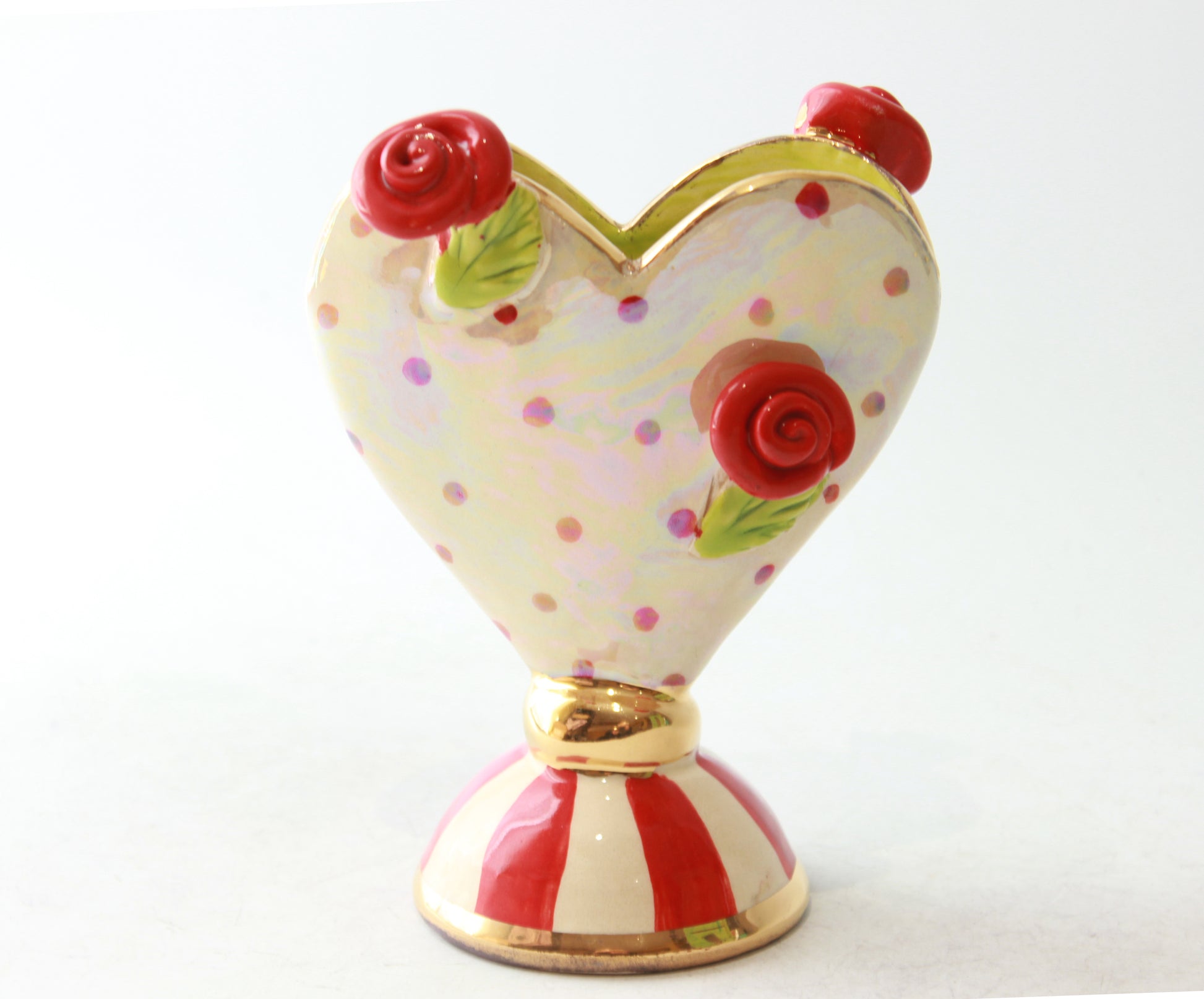 A baby heart vase is just under 5 inches high but it packs a decorative punch if you place it in your home! This model has had Mary Rose's signature studded roses applied to the surface each accompanied by a leaf, and then decorated with a rich red colour