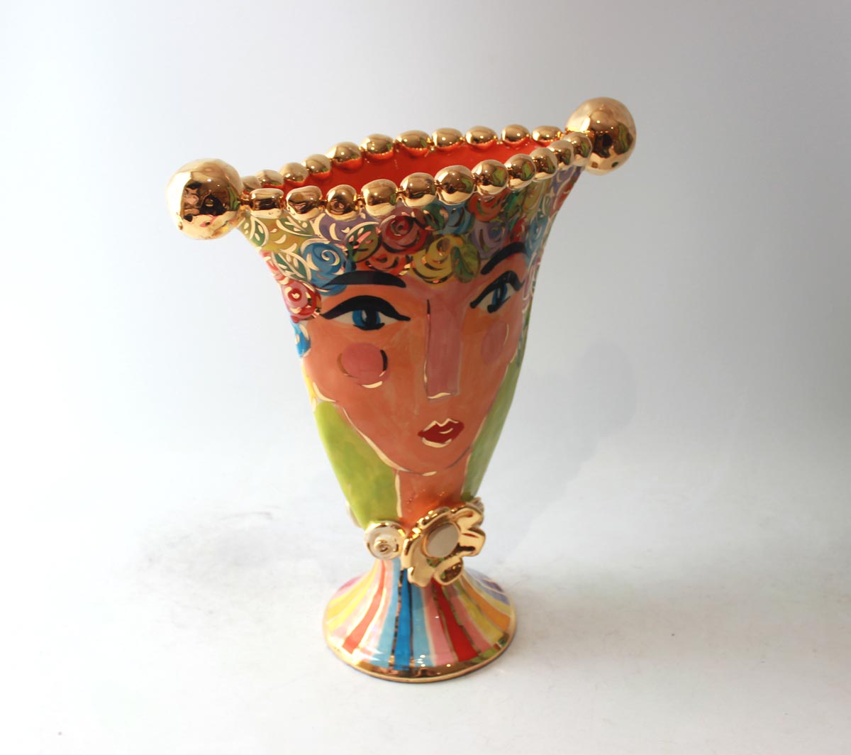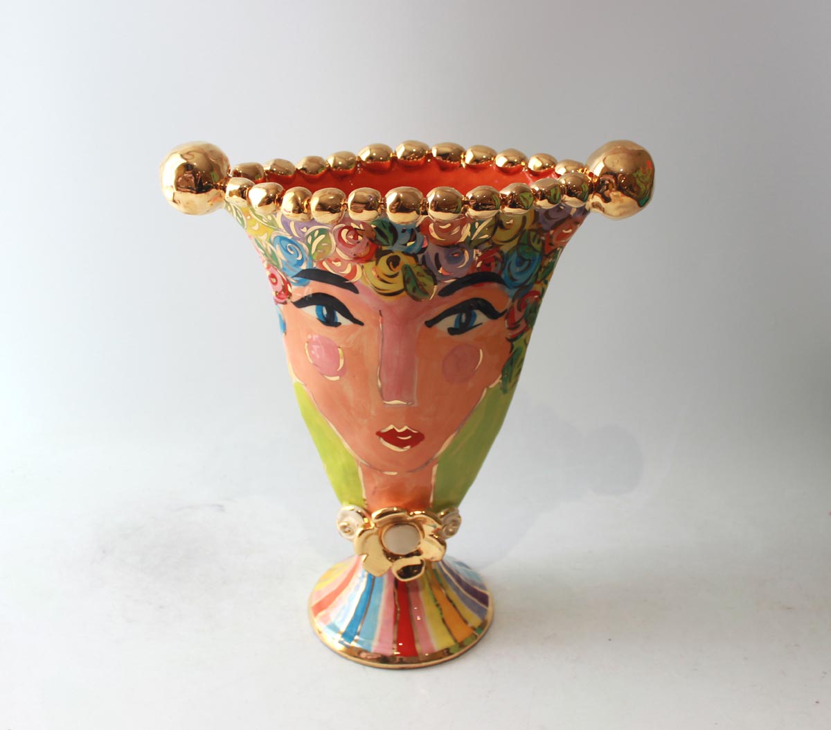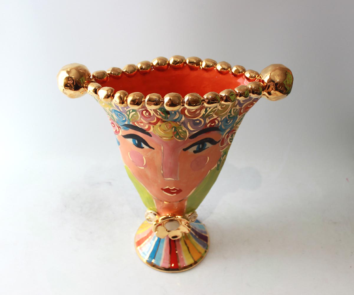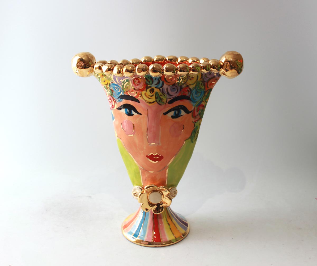 This Vase has a slightly different shape than usual...its called a "Gondola Vase" and this one features a rather glamorous lady who has brightly multicoloured Pastel Rosebush for hair and is flecked in accents of 24 carat gold! The rim is encrusted with ceramic gold beads and the piece stands around 14 inches in height