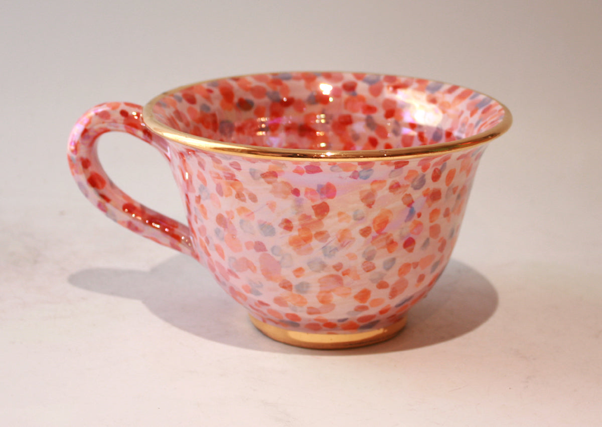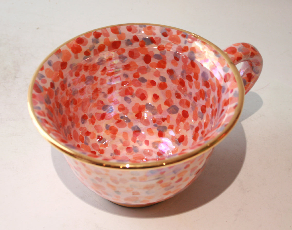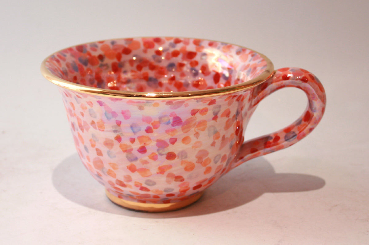 Here is a Cup that won't run out of Tea quickly...! Mary Rose's Breakfast Cups are bigger versions of her regular Cups which are actually large enough to serve as bowls! This one is painted in "Confetti" of pink shades with accents of 24 carat old, and stands just under 4 inches tall and 6 inches in diameter...