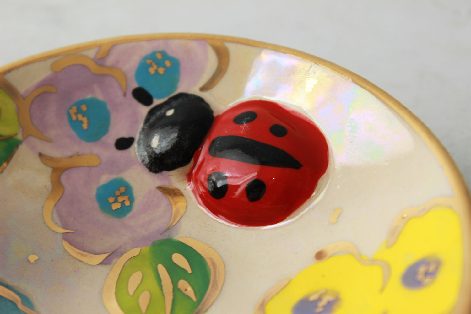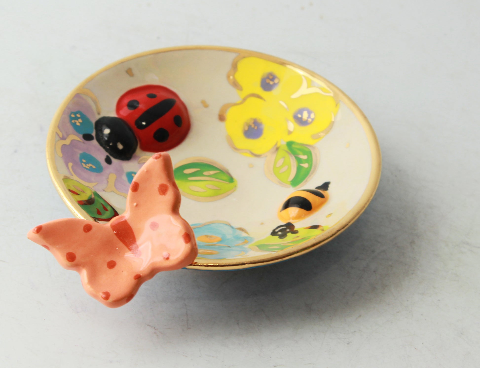 The nightmare scenario of finding your dish of delights suddenly populated by insects turned into a thing of beauty by Mary Rose. The insects become cute decorative friends floating between pretty little collections of flowers. The saucer itself is only about 4 inches in diameter so you can squeeze this into the most congested of spaces quite easily.