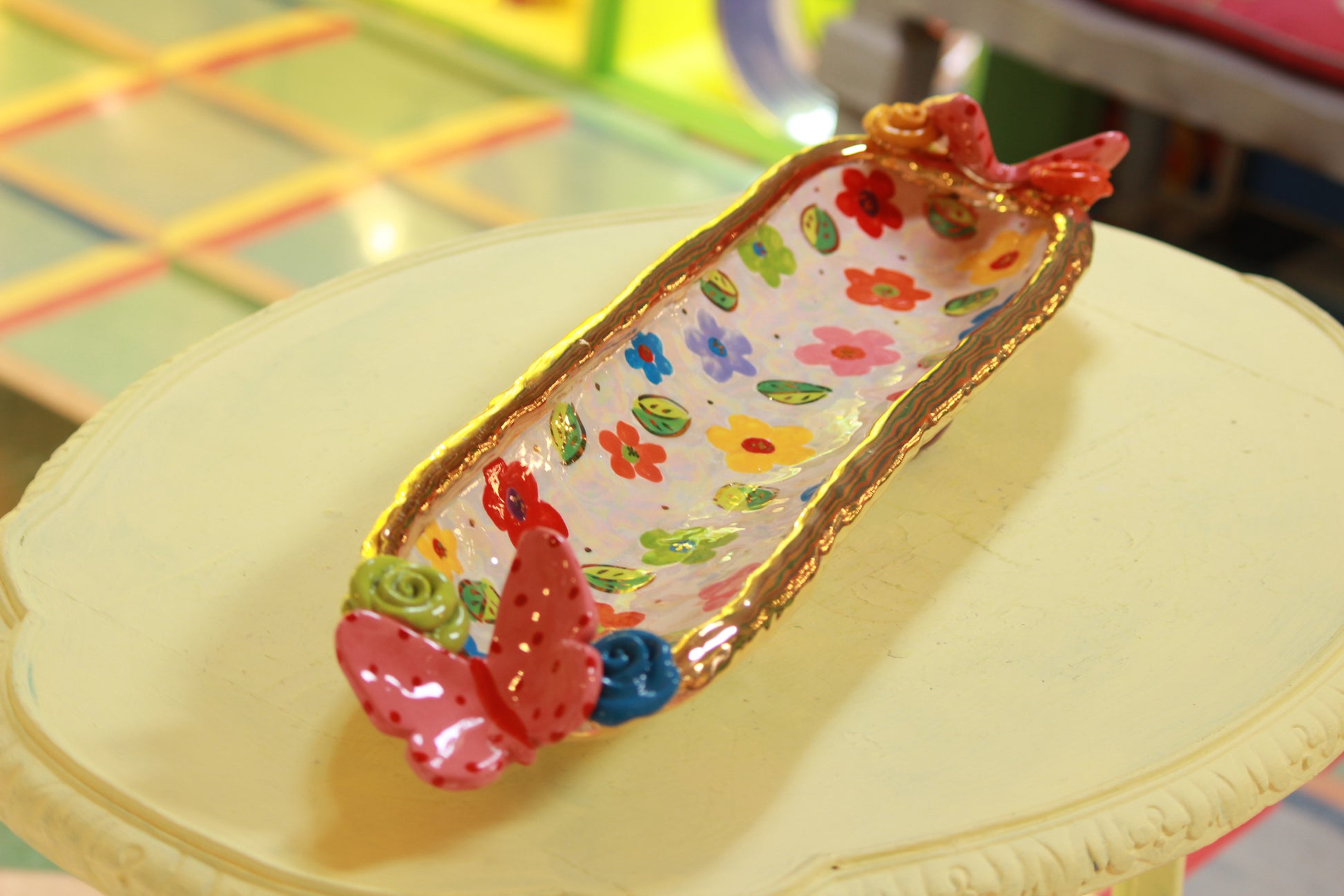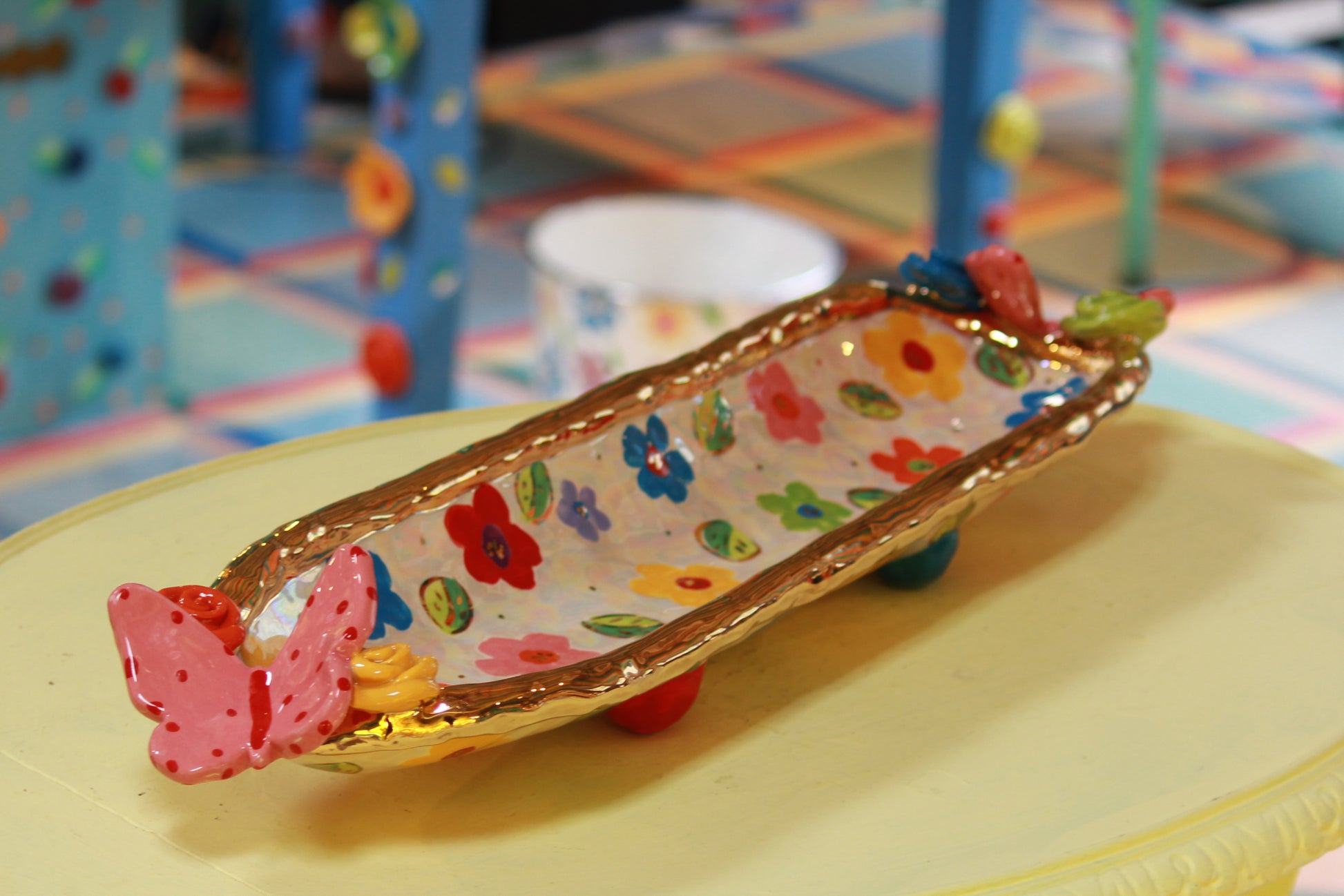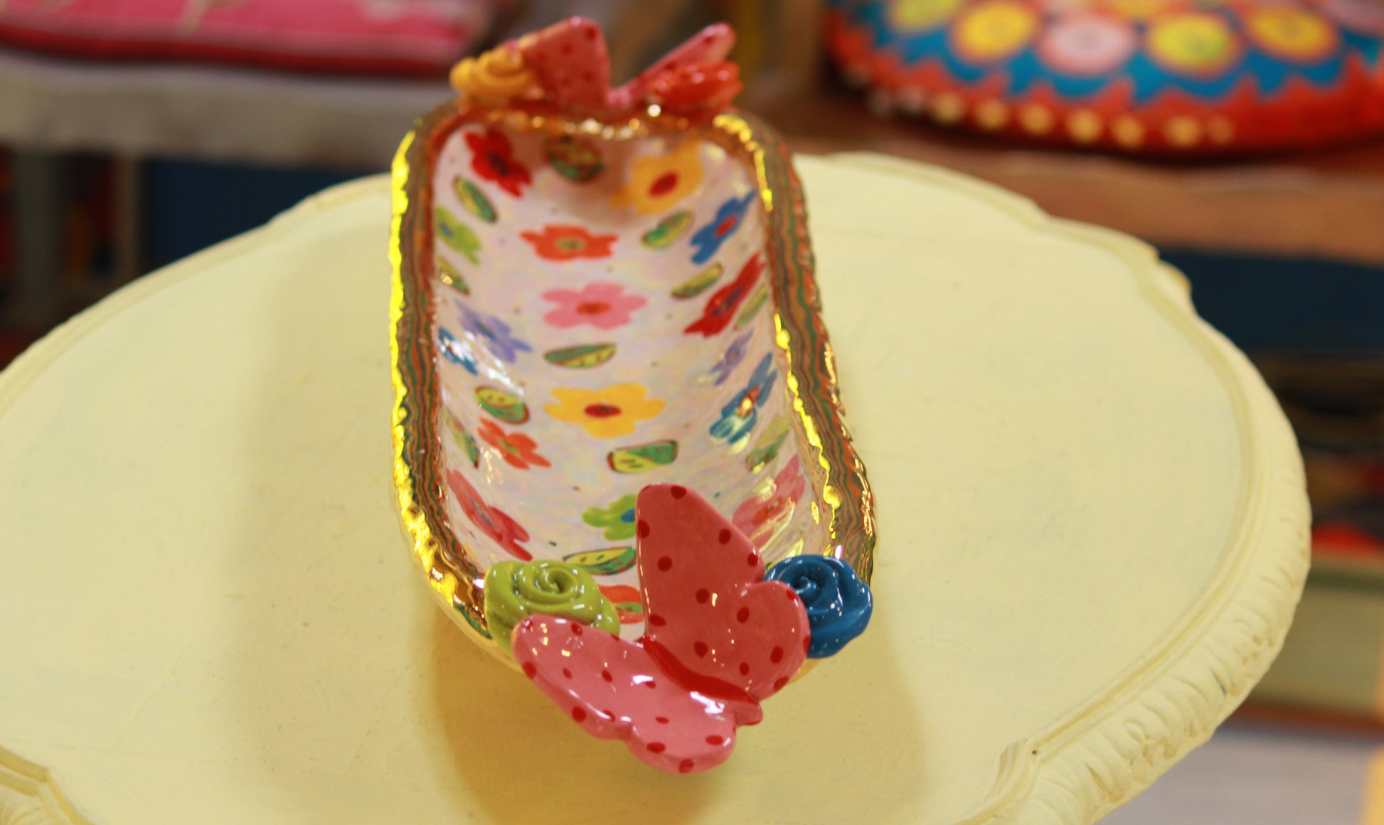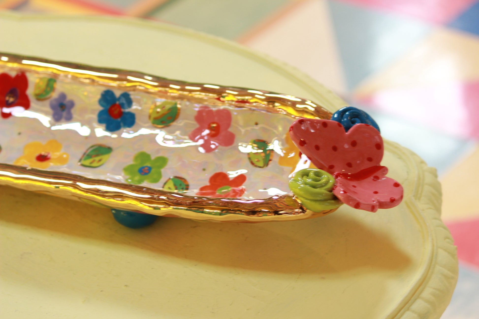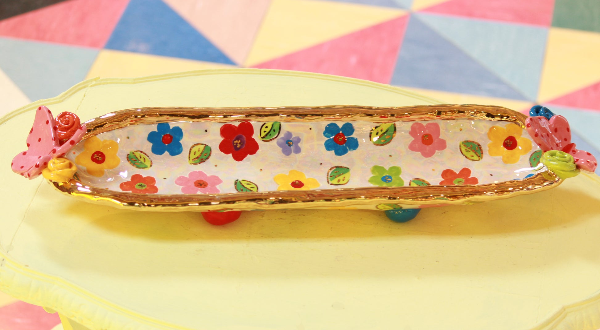 Mary Rose's Butterflies and Daisies collection includes a baguette tray. The piece is sculpted from clay and sits on 4 round feet. It has a very pronounced rim and the handles at each end are large pink butterflies edged with two roses. The piece is about 25 inches long and will outlive a thousand baguettes!