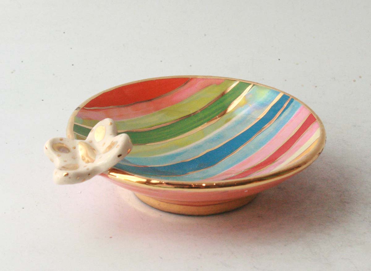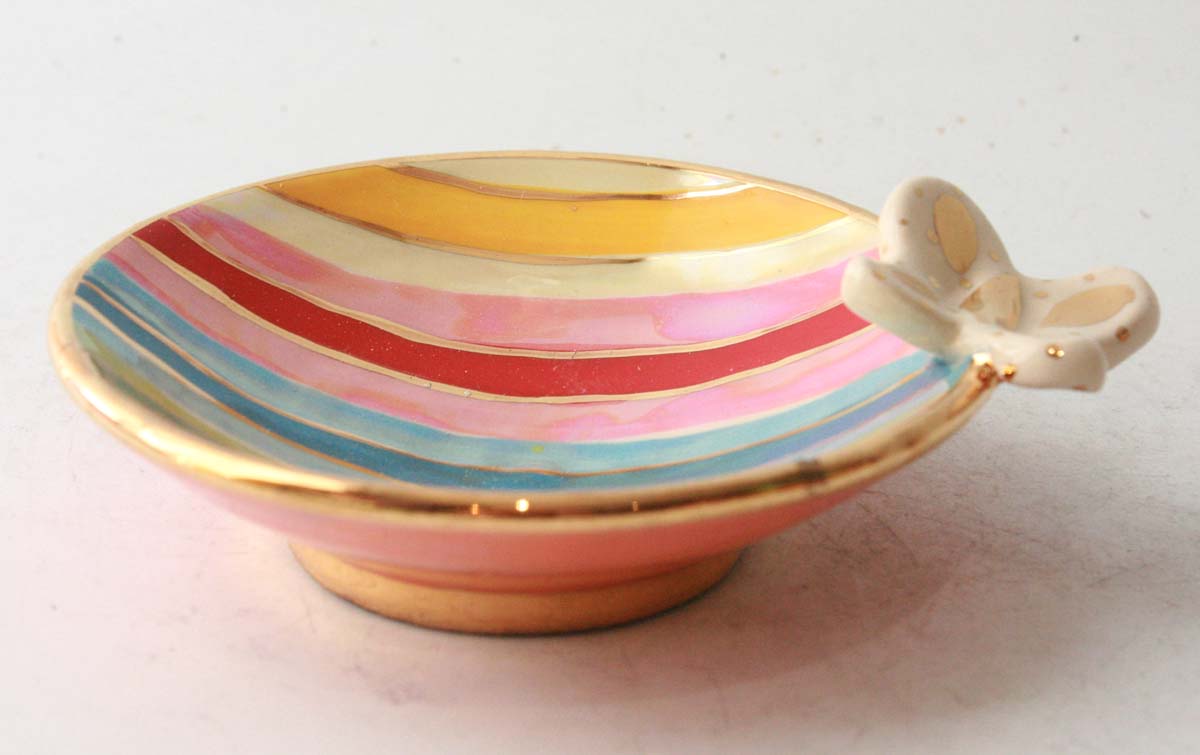 This little Saucer stands around 4 inches in diameter, and has been invaded by Butterflies! Instead of the traditional Rose or Crown, there is a gold and white Butterfly perched elegantly on its rim...the design is "Lustred Stripe" with accents of 24 carat gold!