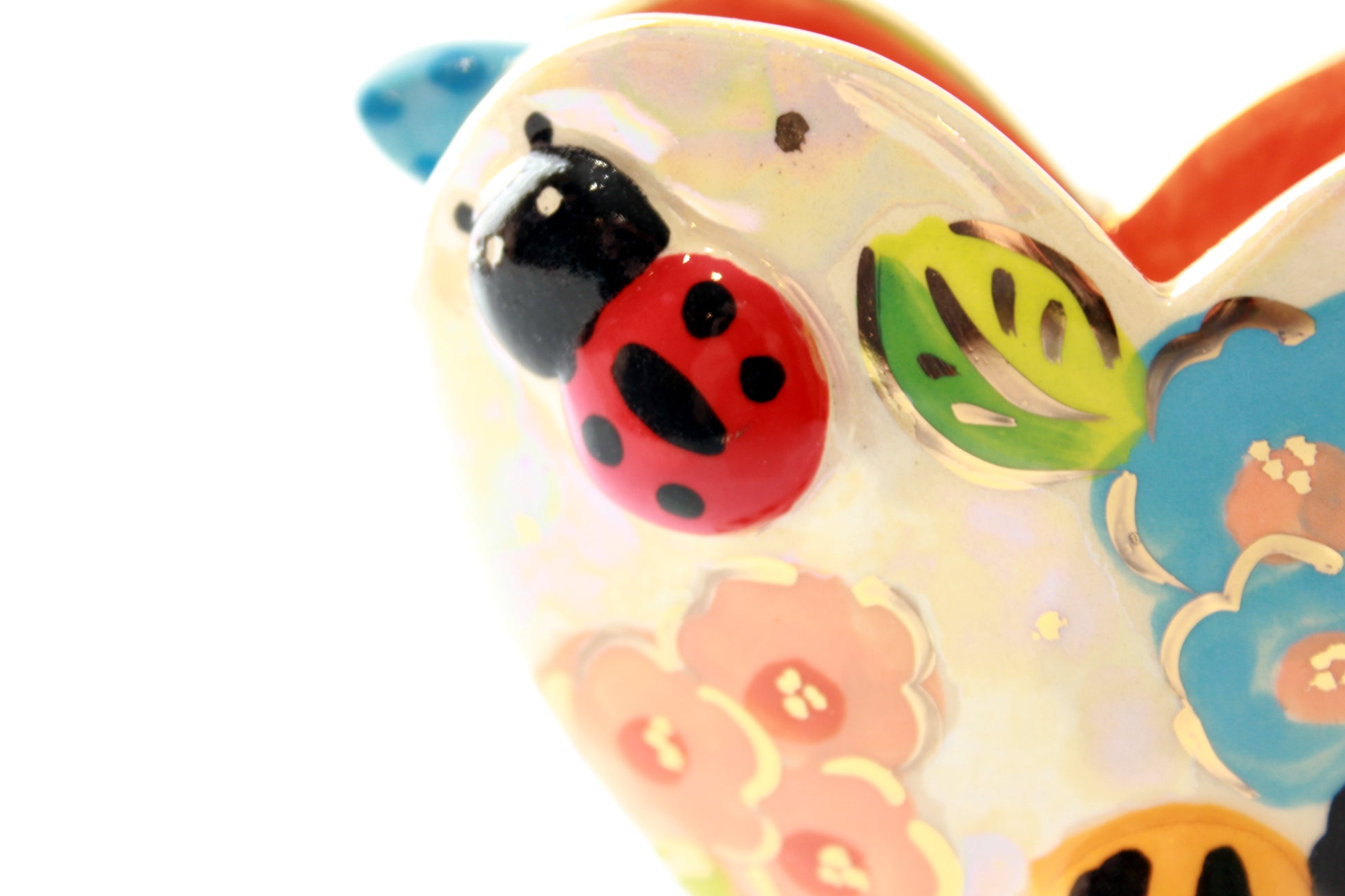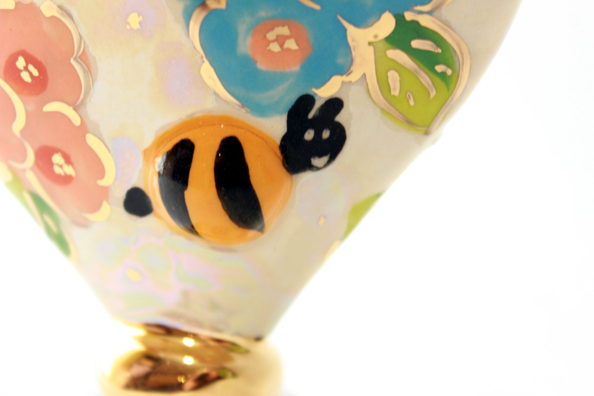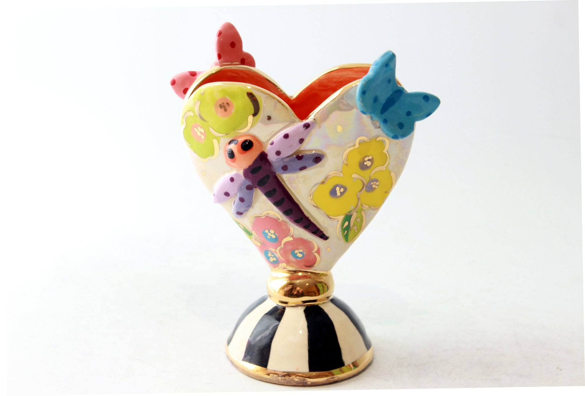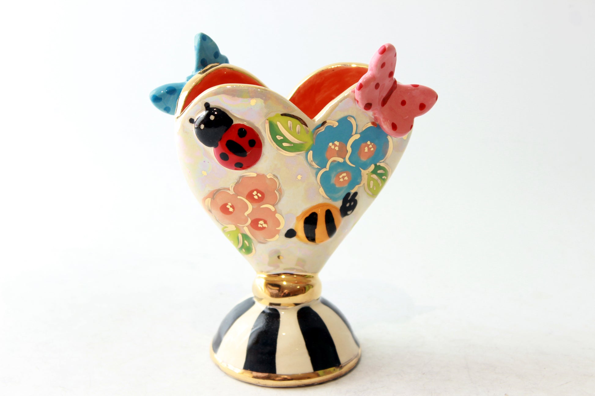 Mary Rose's Baby Heart Vase is almost 5 inches tall and is a thing of eye catching wonder when casually left on a mantlepiece in your home. This one has had more decorative work than any other Baby Heart Vase with Bugs in relief applied to the surface along with complete 3D Butterflies and her Petit Fleur design fliing any gaps that could possibly be left