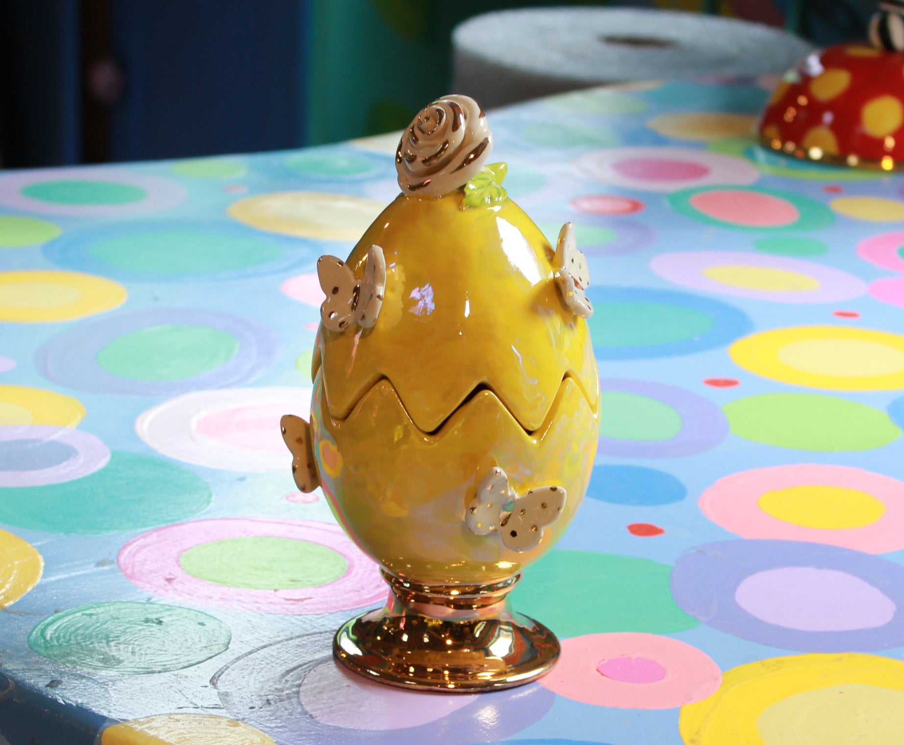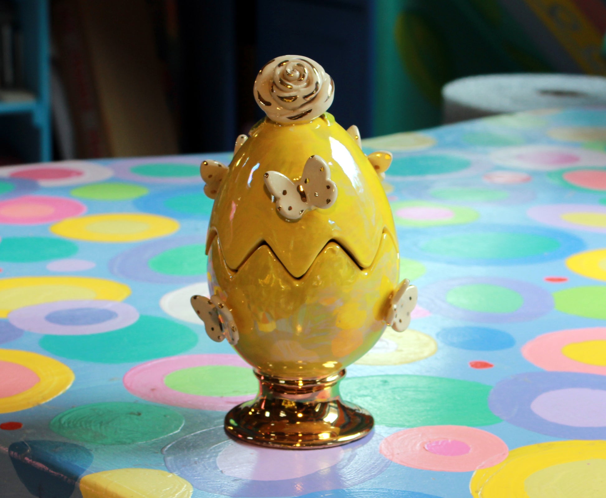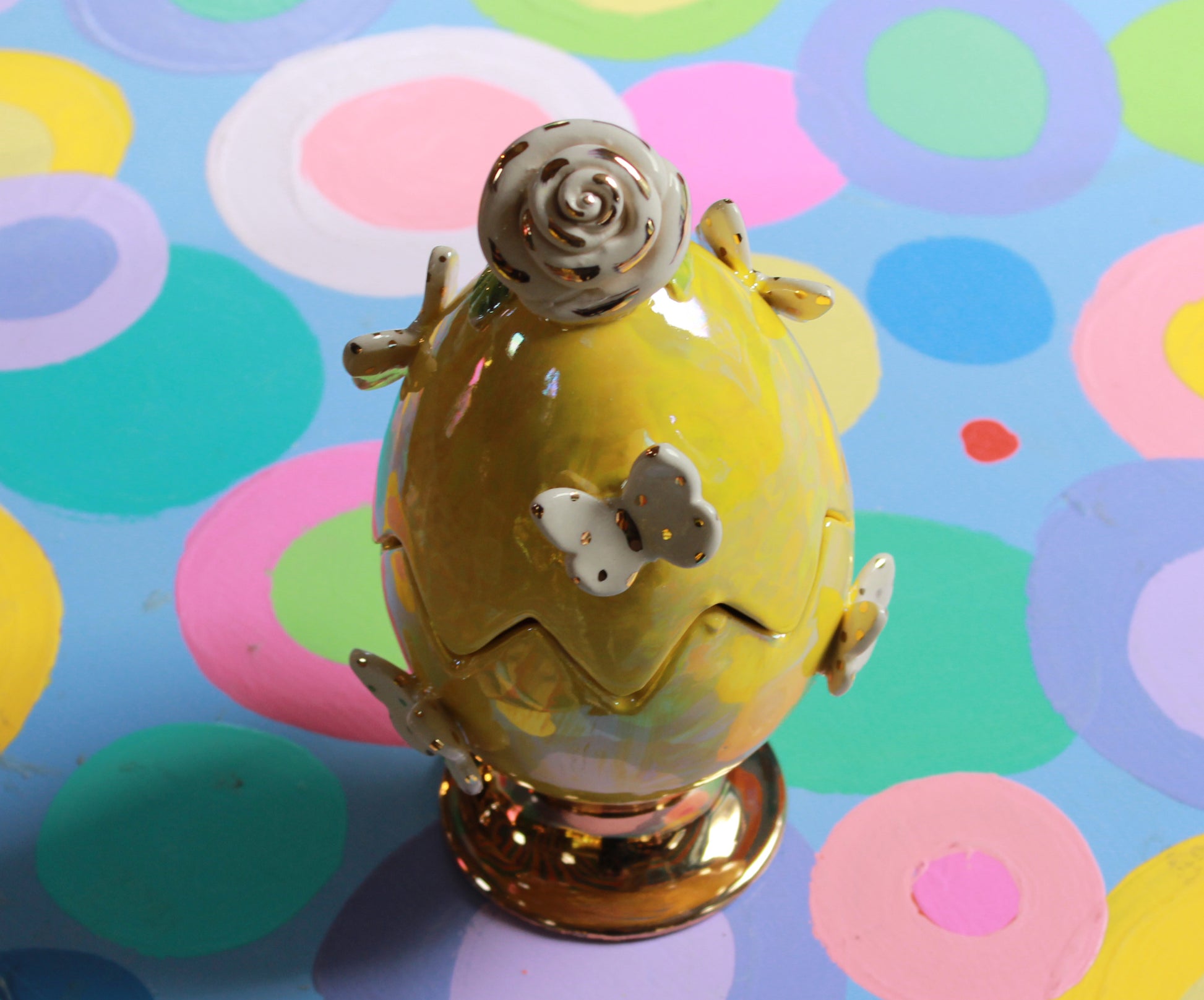 Another piece that's been affected by the great butterfly plague! This egg, in a traditional yellow, has a crowd of the winged creatures clinging to its shiny iridescent surface. There is a gold flecked rose on top. The egg opens up so that it can be stuffed with anything you choose and it's a little over 7 inches high