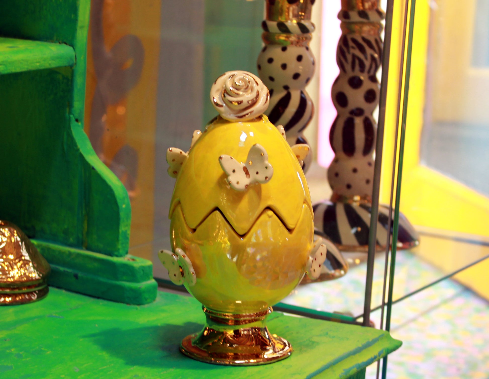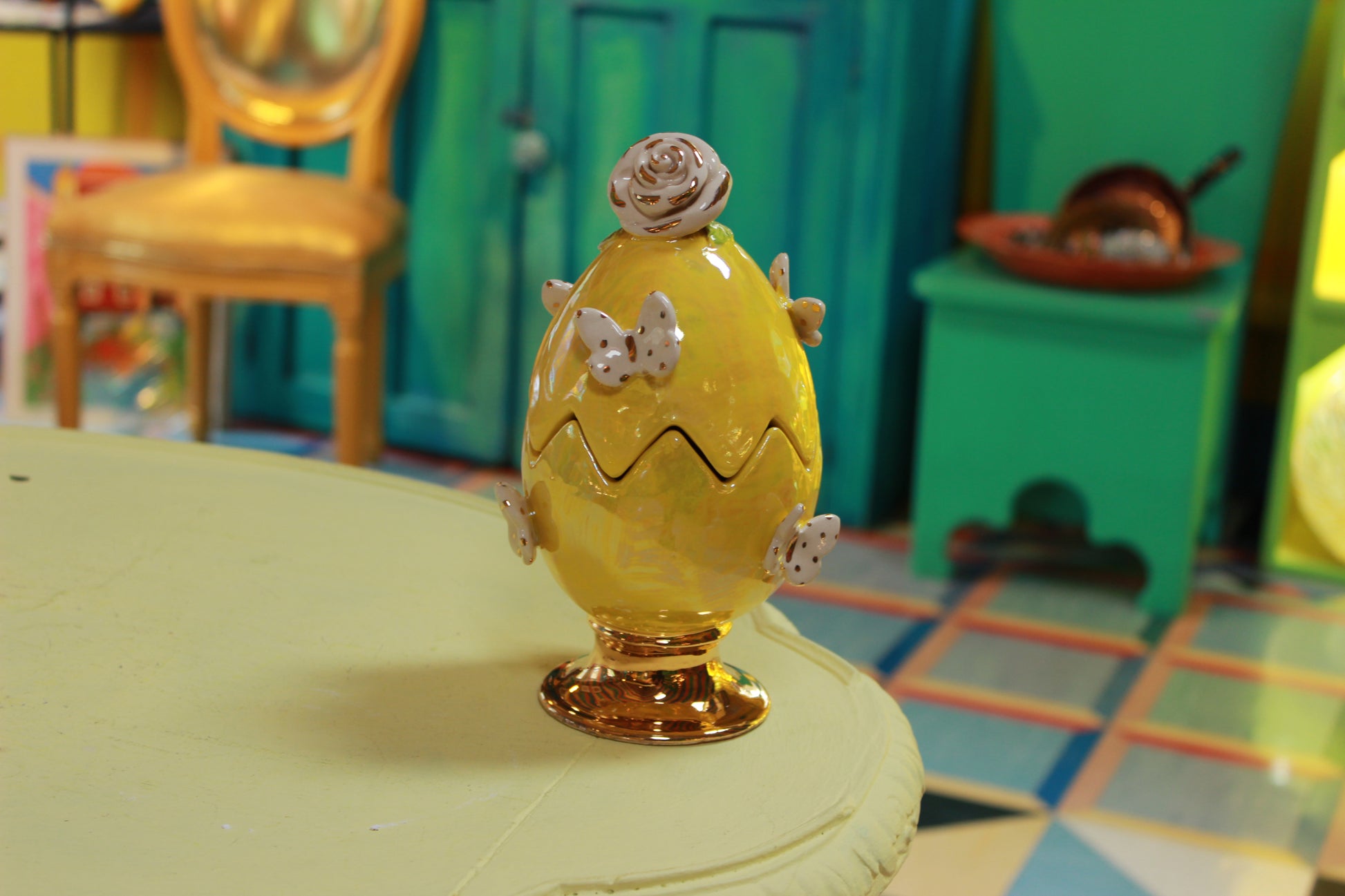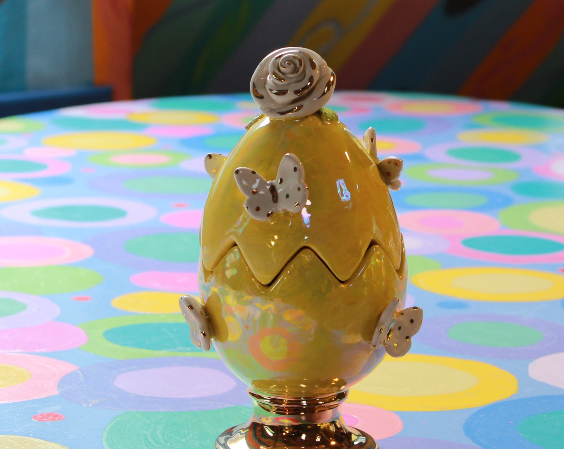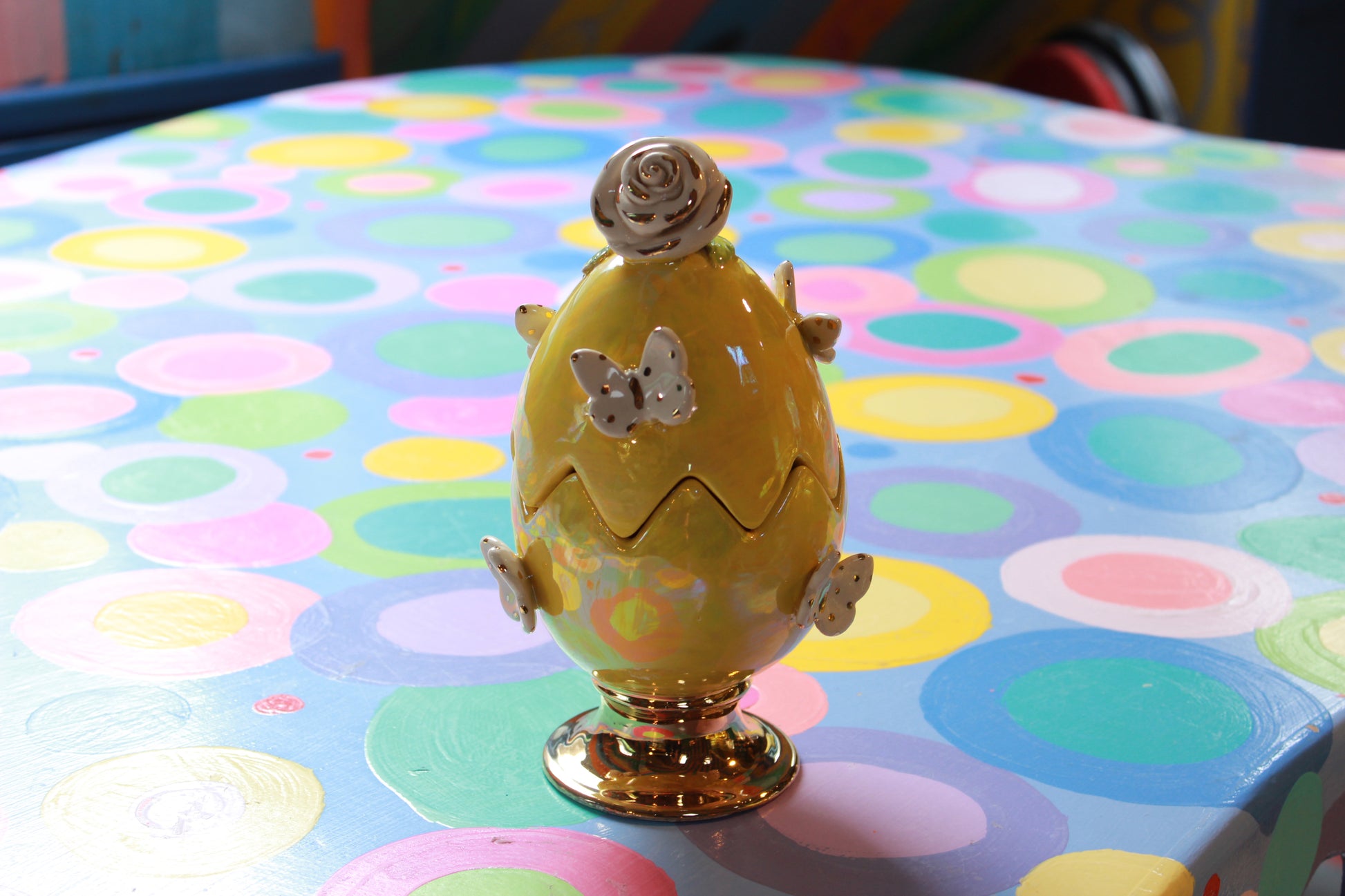 Another piece that's been affected by the great butterfly plague! This egg, in a traditional yellow, has a crowd of the winged creatures clinging to its shiny iridescent surface. There is a gold flecked rose on top. The egg opens up so that it can be stuffed with anything you choose and it's a little over 7 inches high