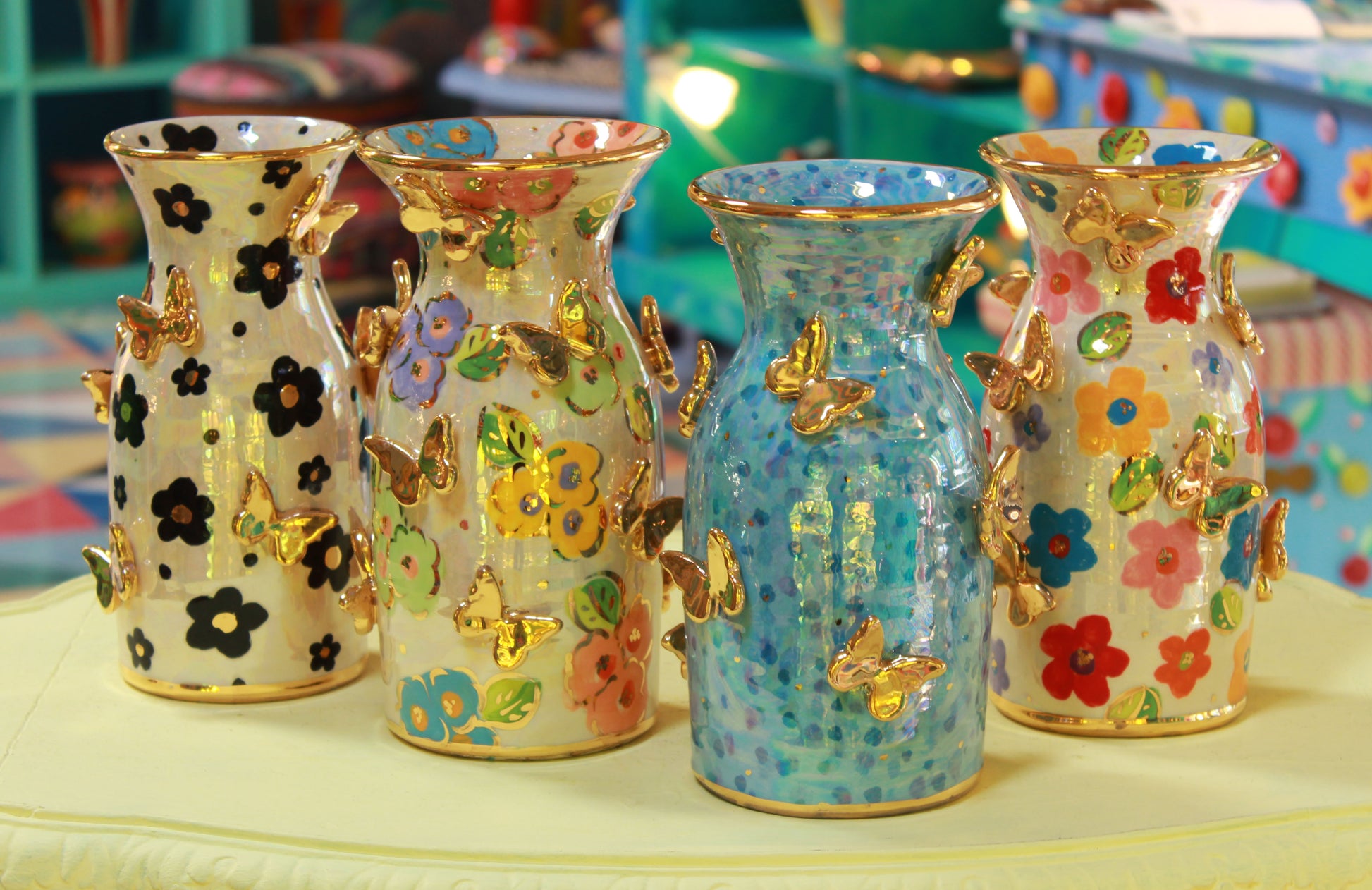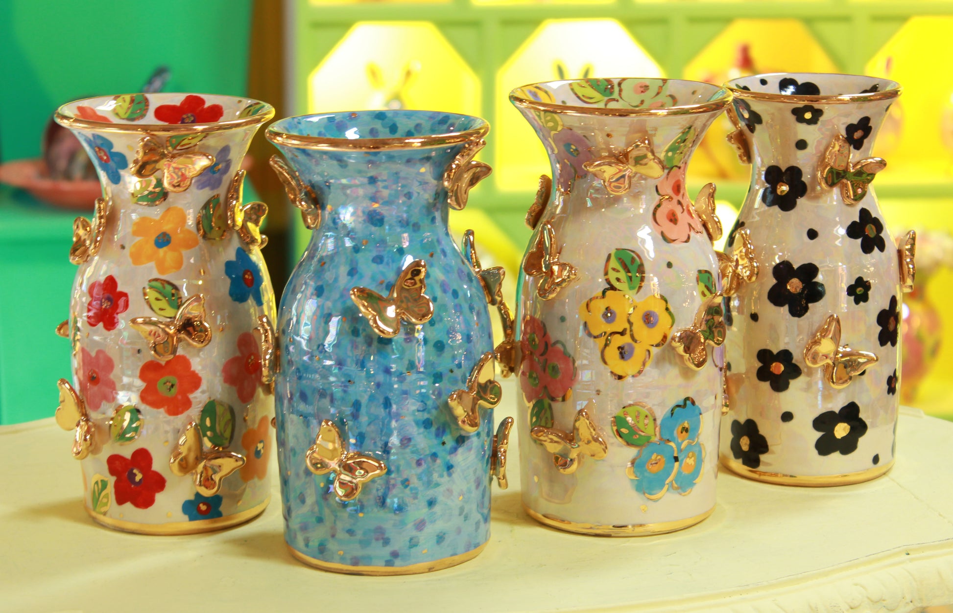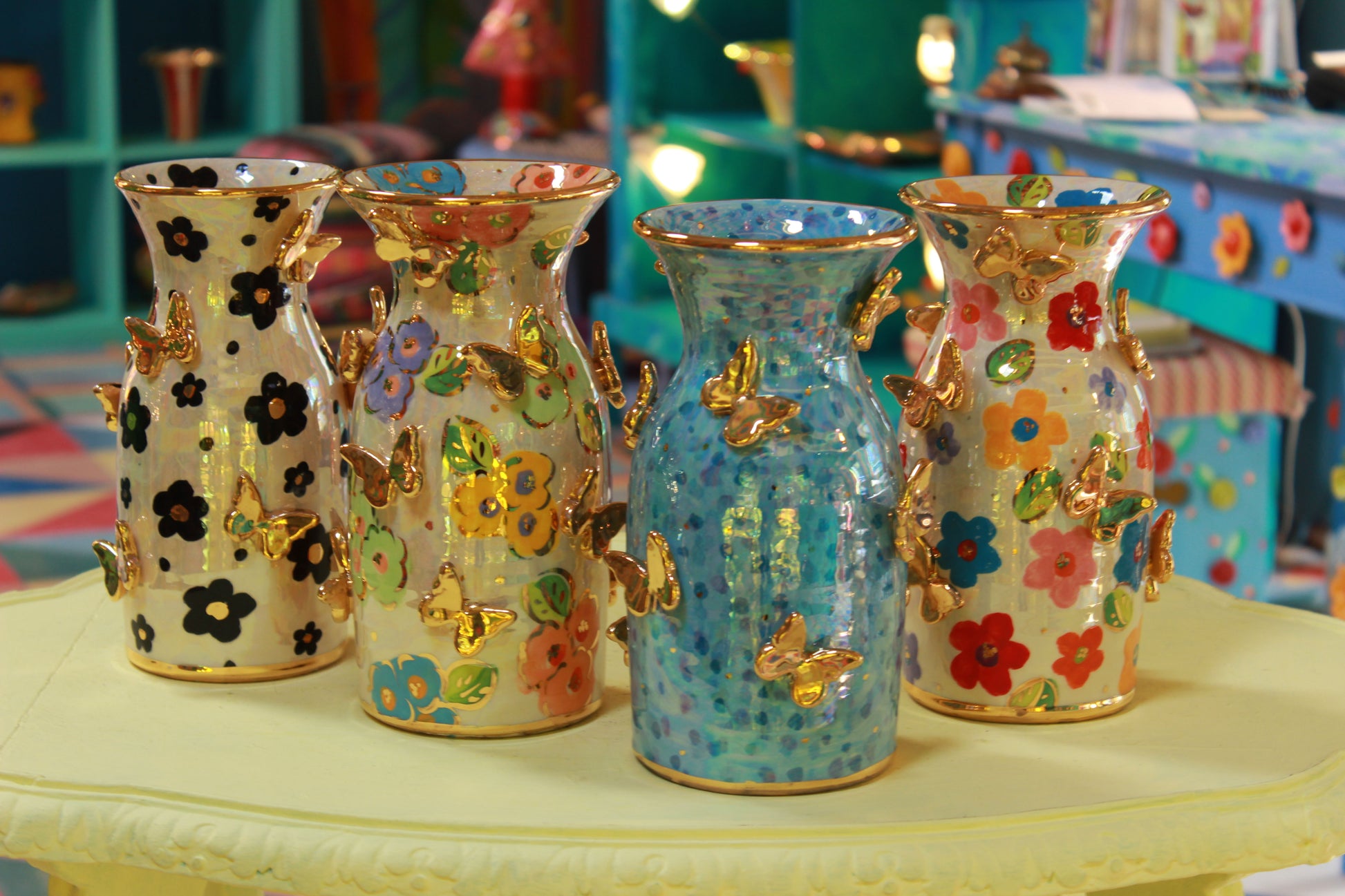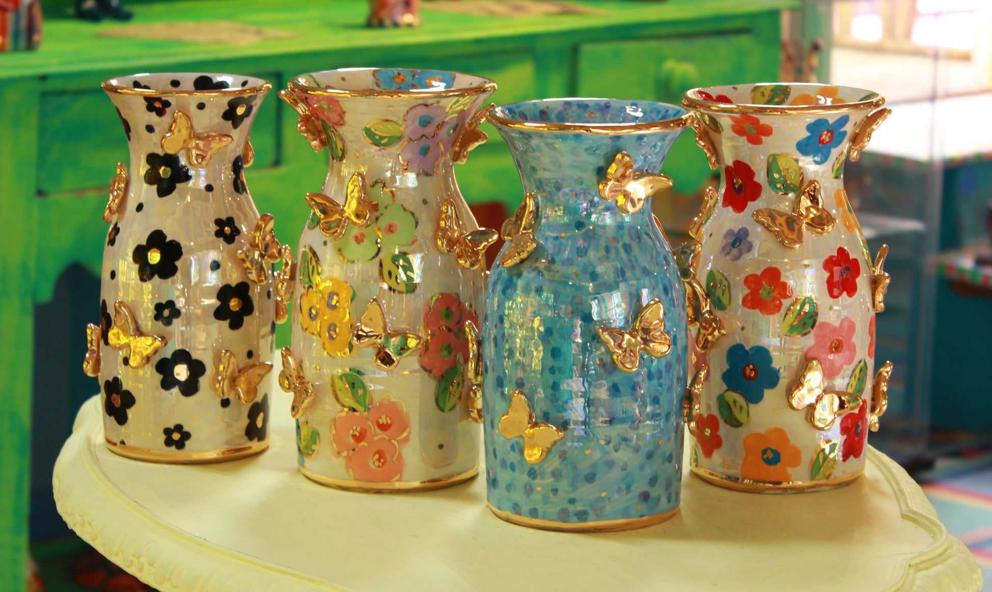 Mary Rose's wine carafe makes for a beautiful centrepiece for your dinner party. Ceramic is of course one of the most traditional materials to store wine in, and it will make a perfect last resting place for your vino before it fulfils its sacred purpose. They are 8 inches high and have a capacity of almost 1 litre. The price is for one only... there are four designs pictured and you must nominate which one you'd like....Black and White Daisy, Petit Fleur, Blue Confetti or Coloured Daisy. All have been sprinkled with golden butterflies by the artist. You can make your choice in the comments section of the order.