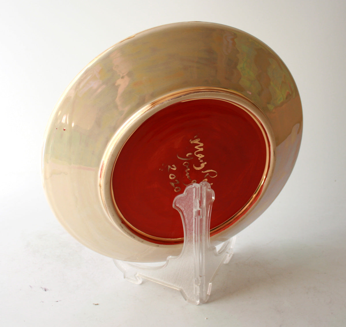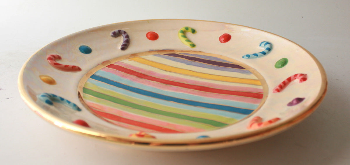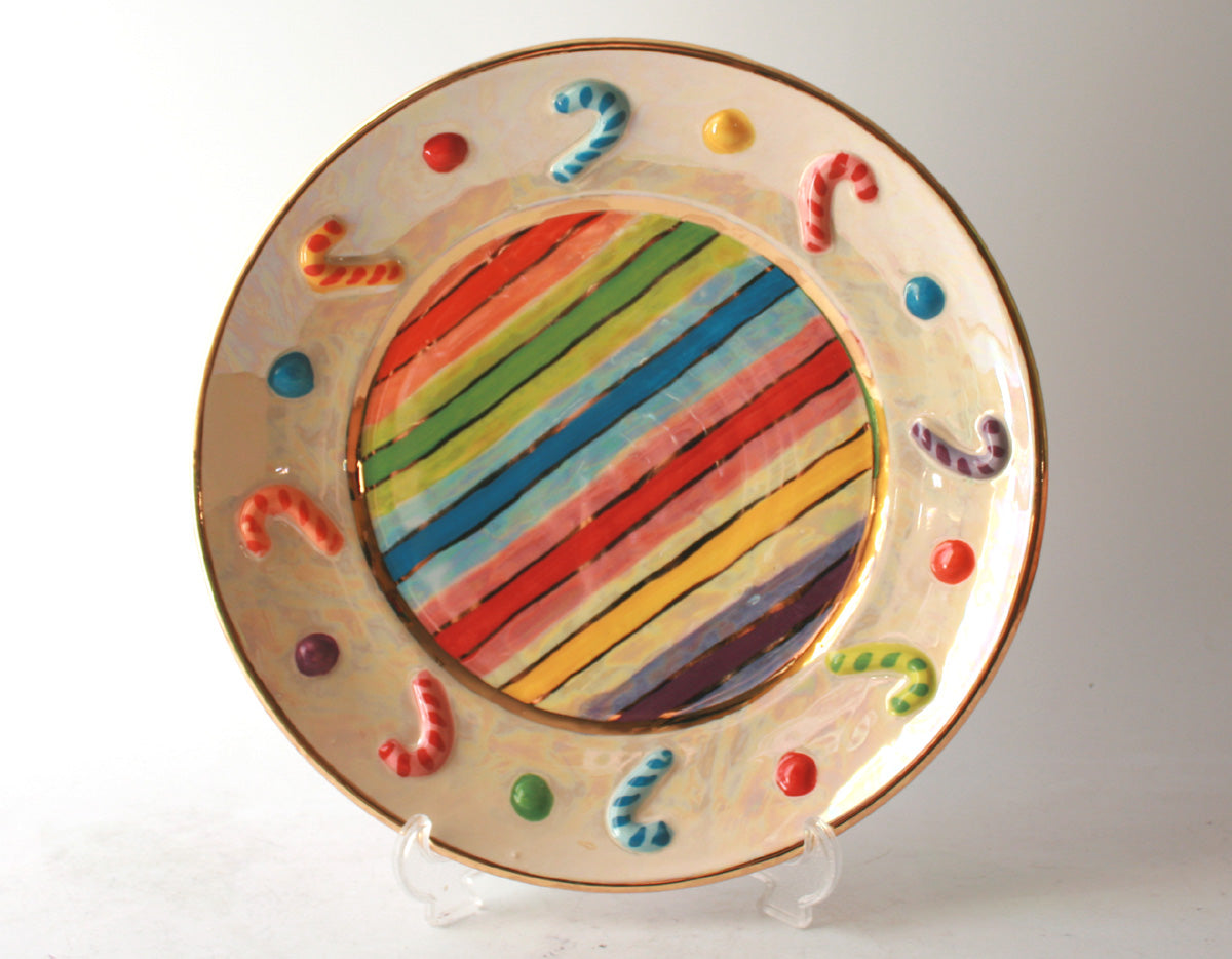 This Dinner Plate is all ready for Christmas in a new for 2020 "Candy Canes" look...it features colourful Canes and Dots on its outer rim and "Lustred Stripe" in the centre, all on a background of beautiful iridescence...it measures just over 11 inches in diameter and will certainly get heads turning at your festivities!