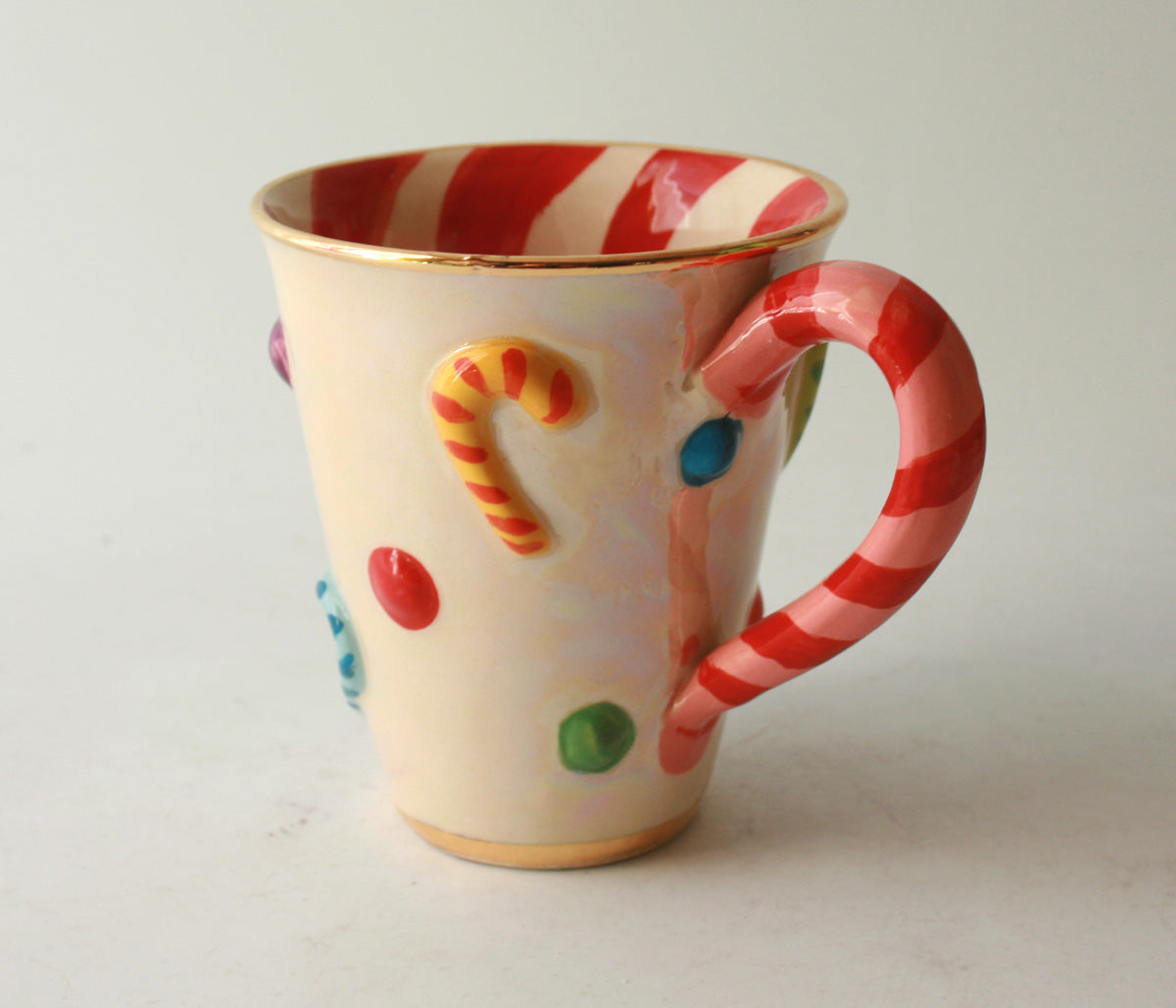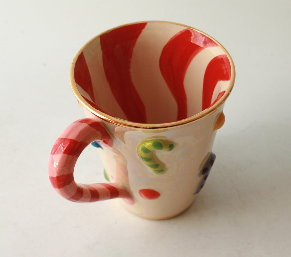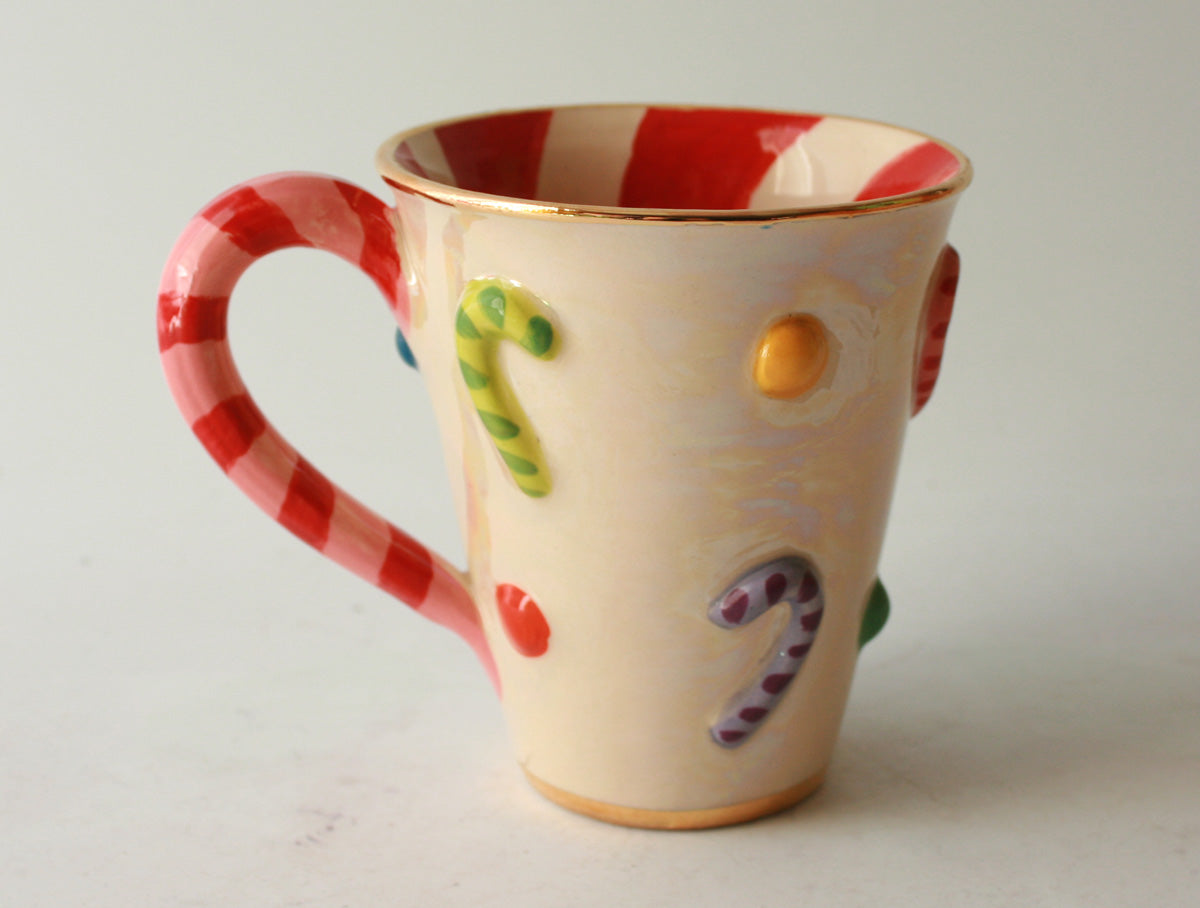 Mary Rose's Mugs get a whole new look this Christmas! This new for 2020 "Candy Canes" design features colourful Canes and Dots on a beautiful iridescent background, with a contrasting red and white striped inside...could this be the perfect Mug for Christmas Morning? We think so!
