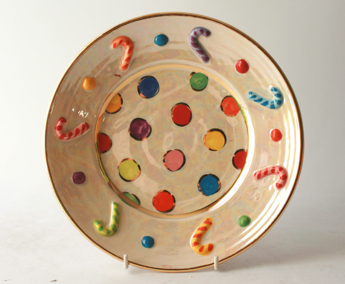 This Side Plate is all ready for Christmas in a new for 2020 "Candy Canes" look...it features colourful Canes and Dots across its outer rim, with matching coloured dots in the centre all on a background of beautiful iridescence...it measures just over 9 inches in diameter and will certainly get heads turning at your festivities!