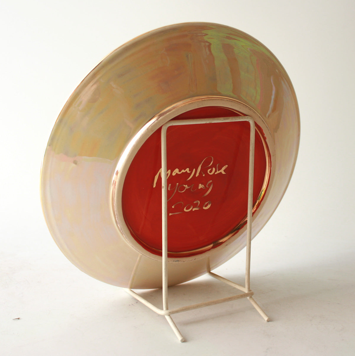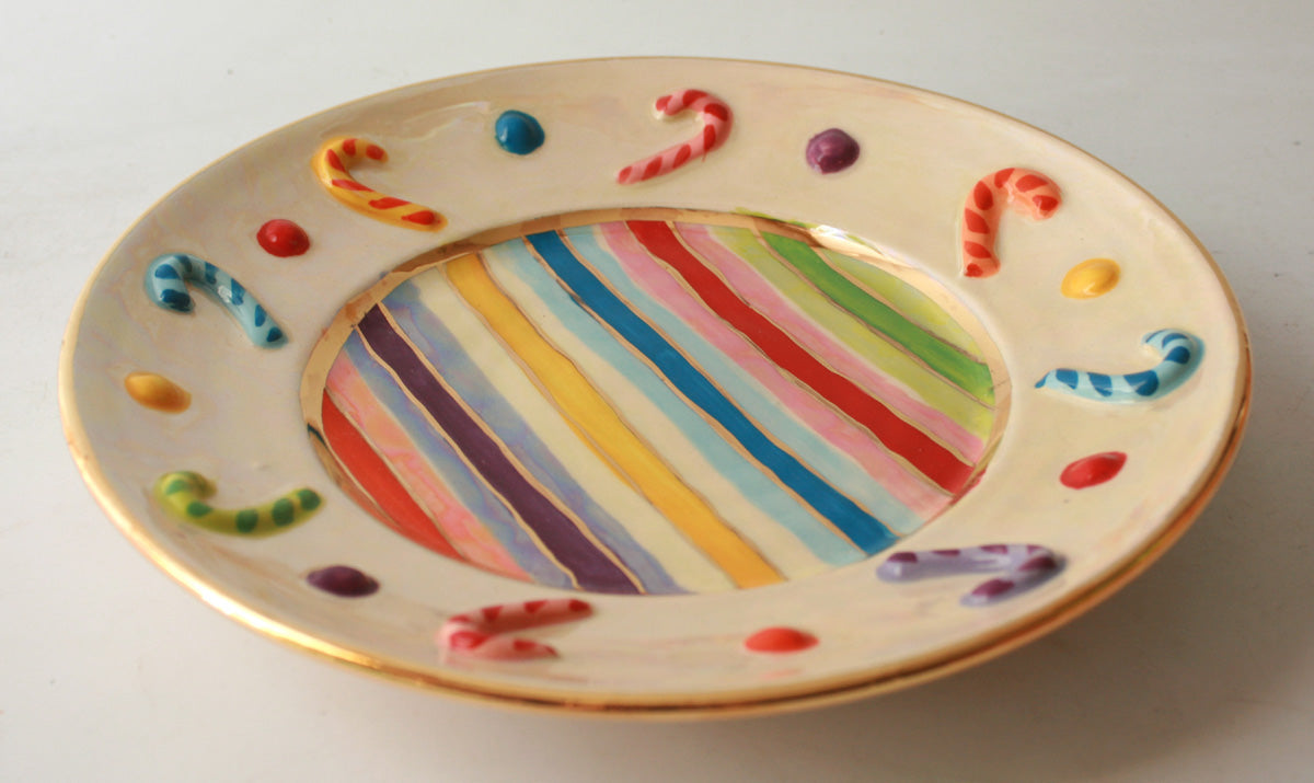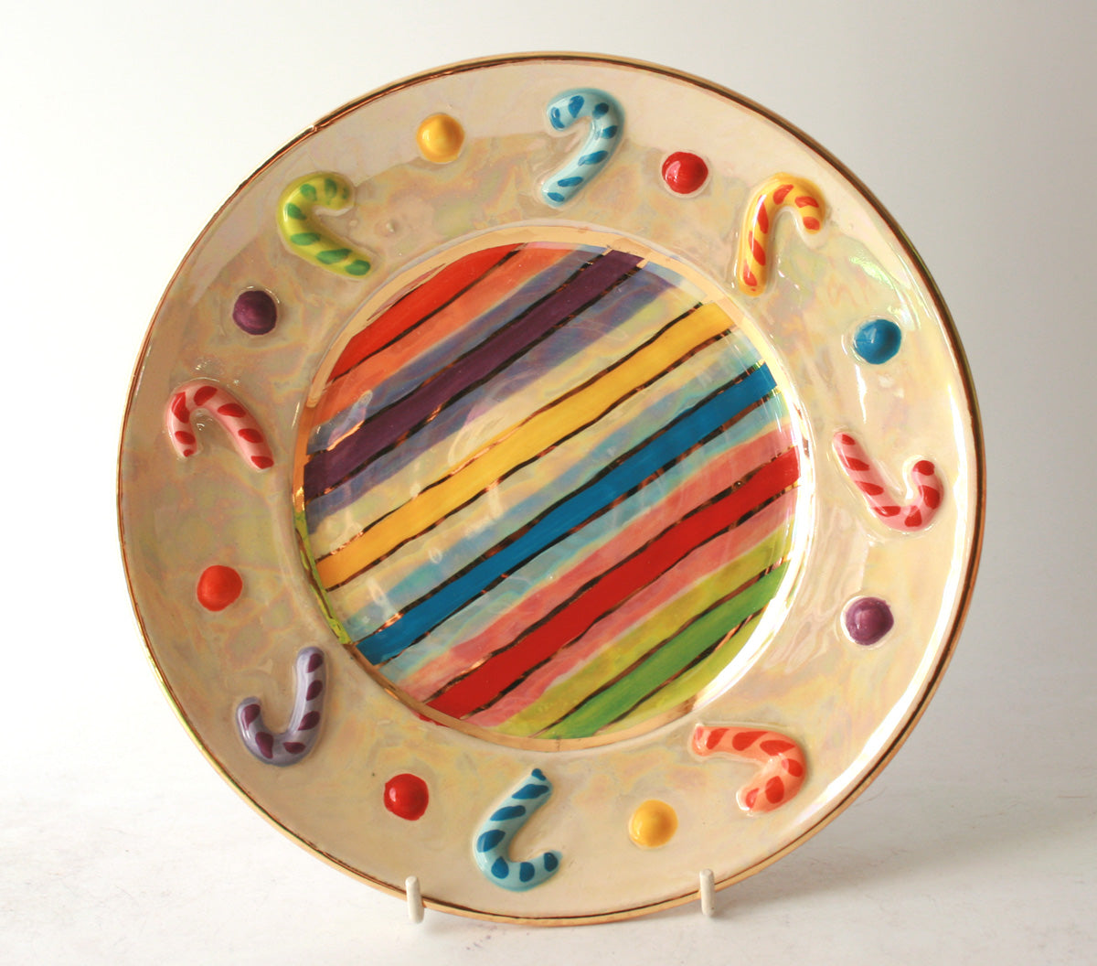 This Side Plate is all ready for Christmas in a new for 2020 "Candy Canes" look which features colourful Canes and Dots on its outer rim and "Lustred Stripe" in the centre, all on a background of beautiful iridescence...it measures just over 9 inches in diameter and will certainly get heads turning at your festivities!