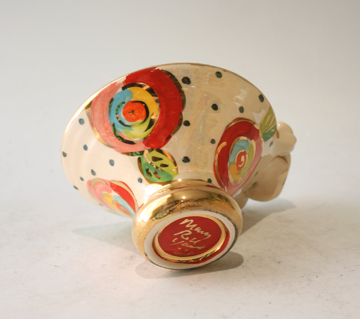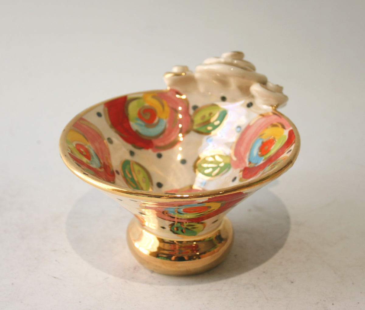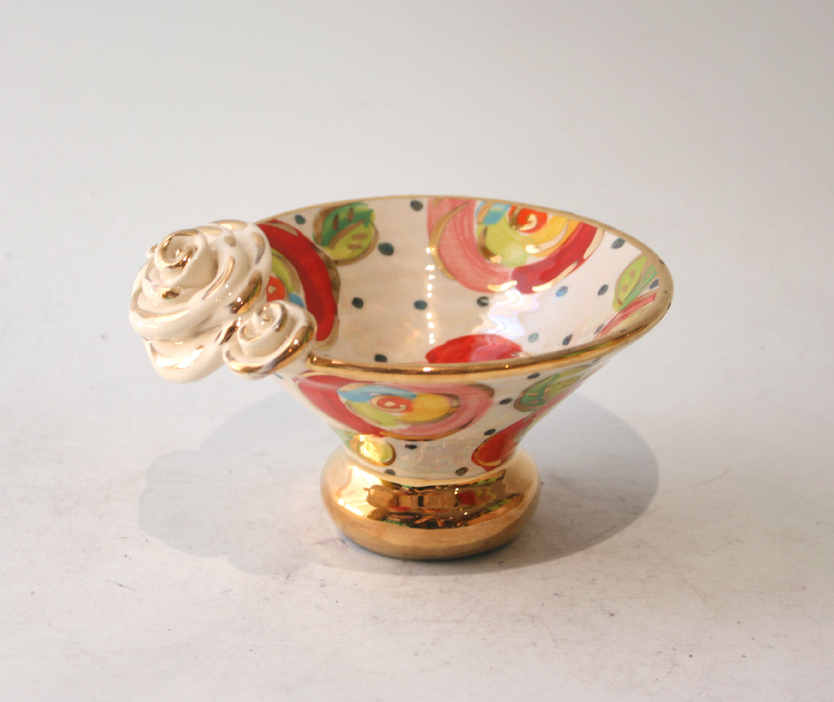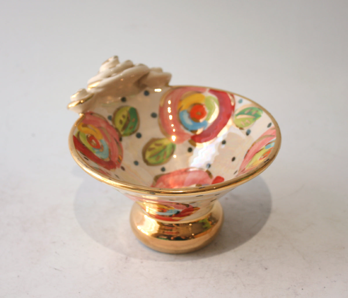 A Candy Dish made by Mary Rose stands around 2.5 inches high and will make the perfect receptacle for whatever you choose to put in it! This one is painted in "Gold New Rose" on a background of polka dots and has three little ceramic roses on its rim...