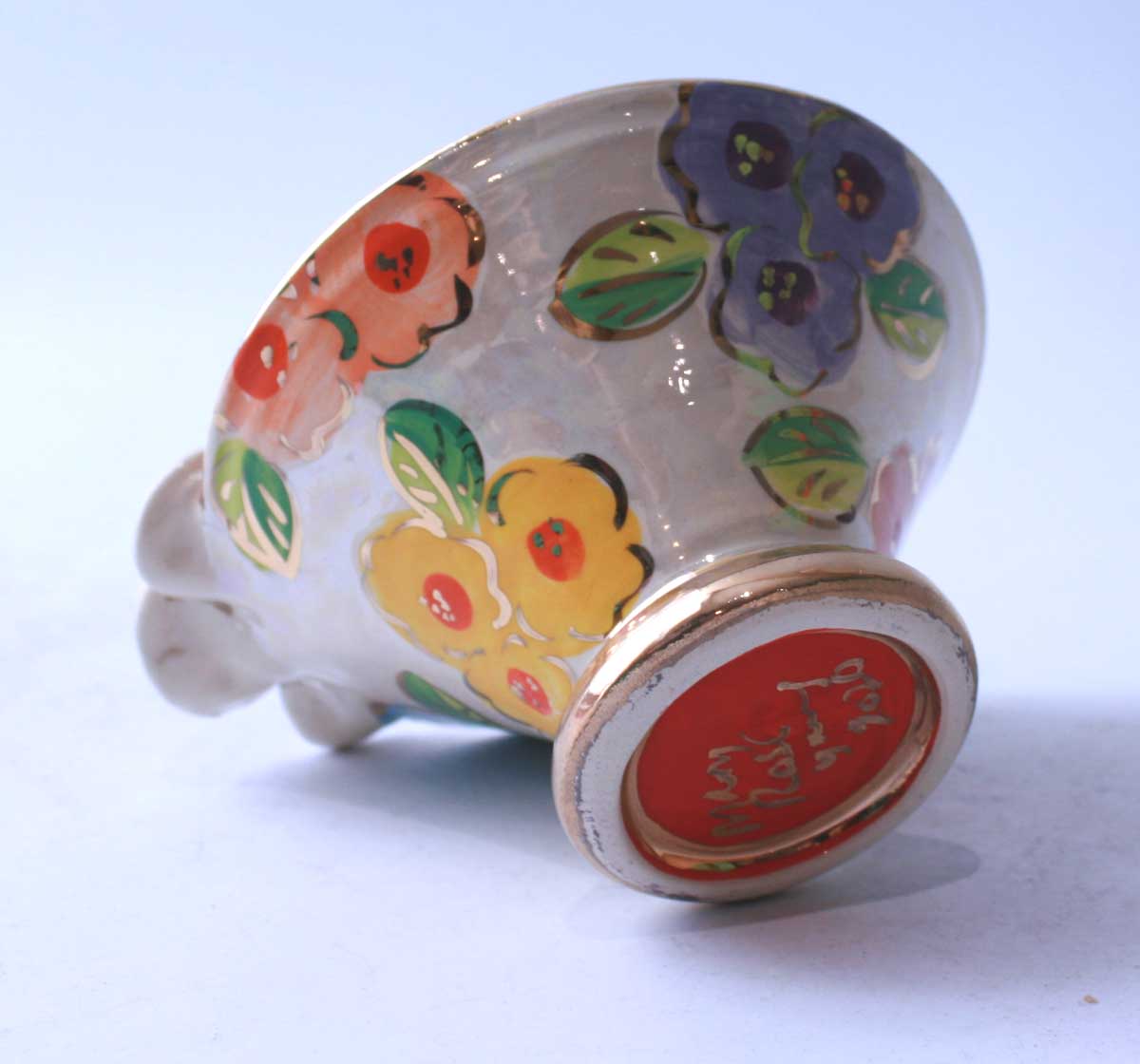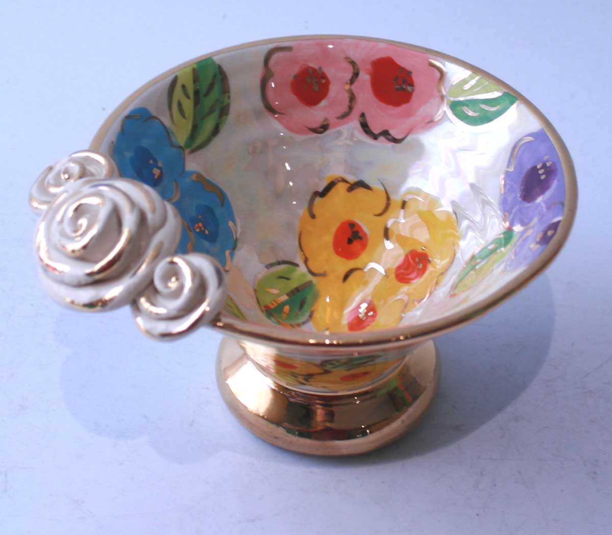 A Candy Dish made by Mary Rose stands 2.5 inches high and is the perfect receptacle for whatever you choose! This one is painted in a new for 2020 design "Petit Fleur", which features colourful blooms of flowers on a beautifully iridescent background...
