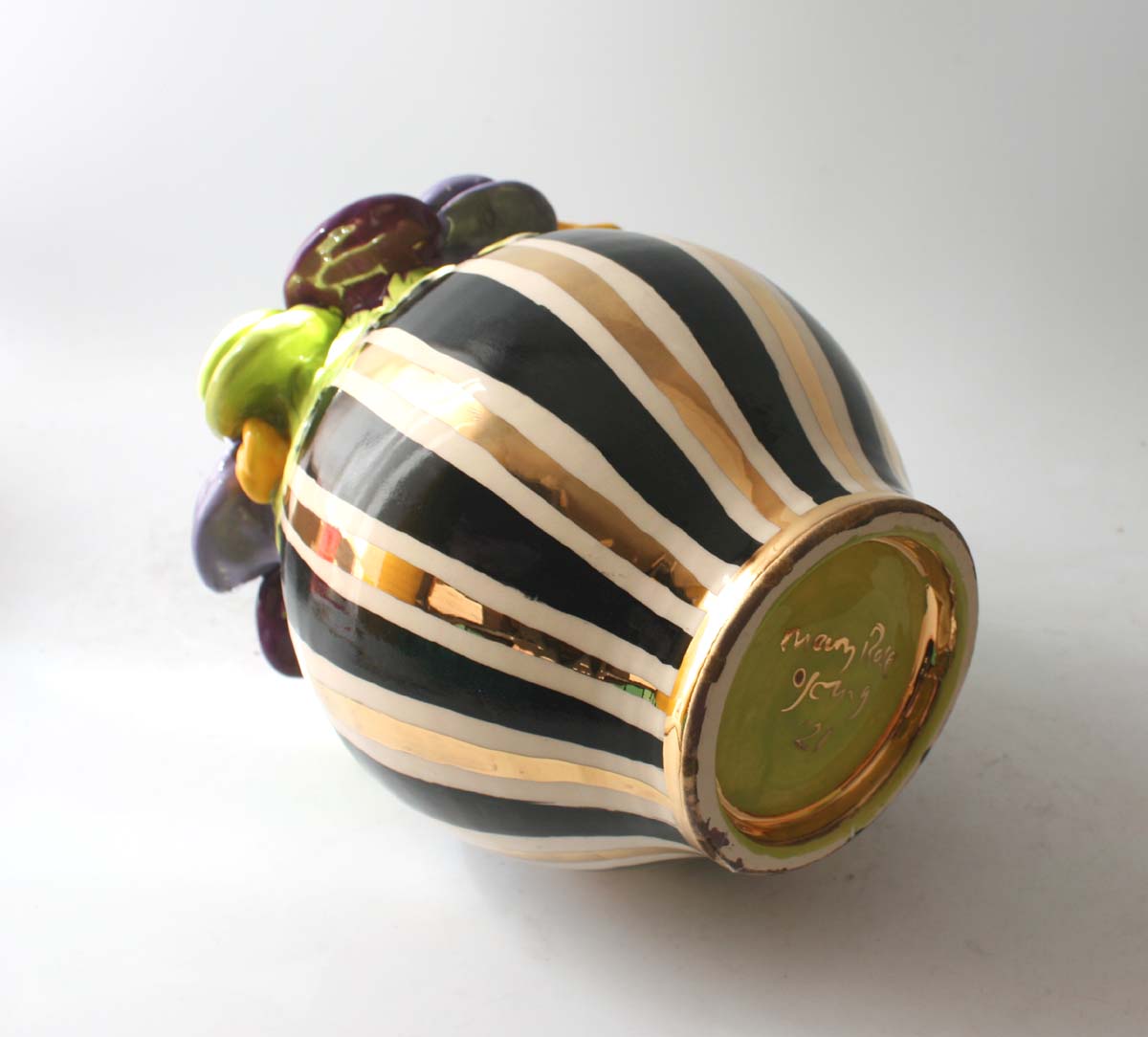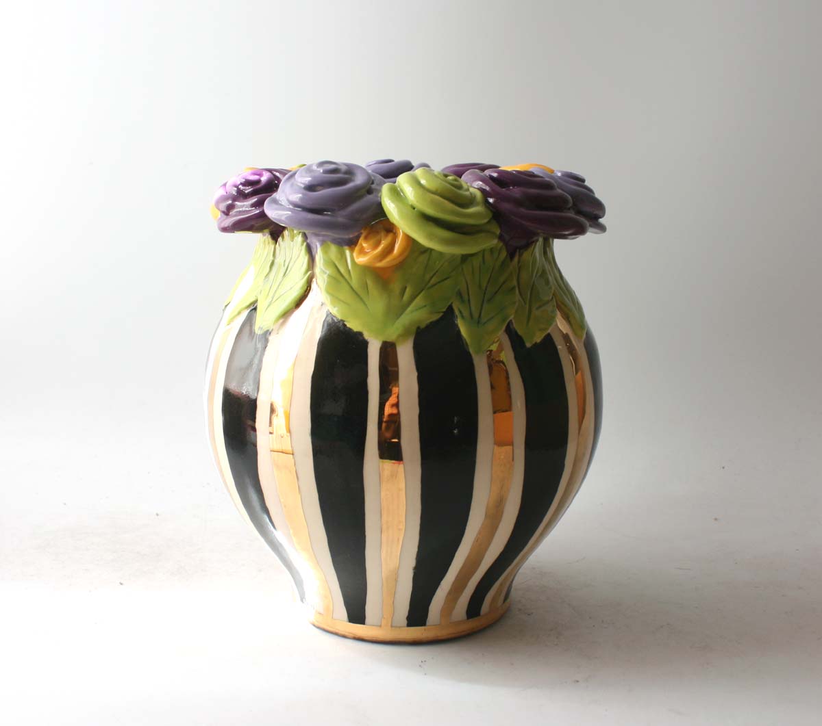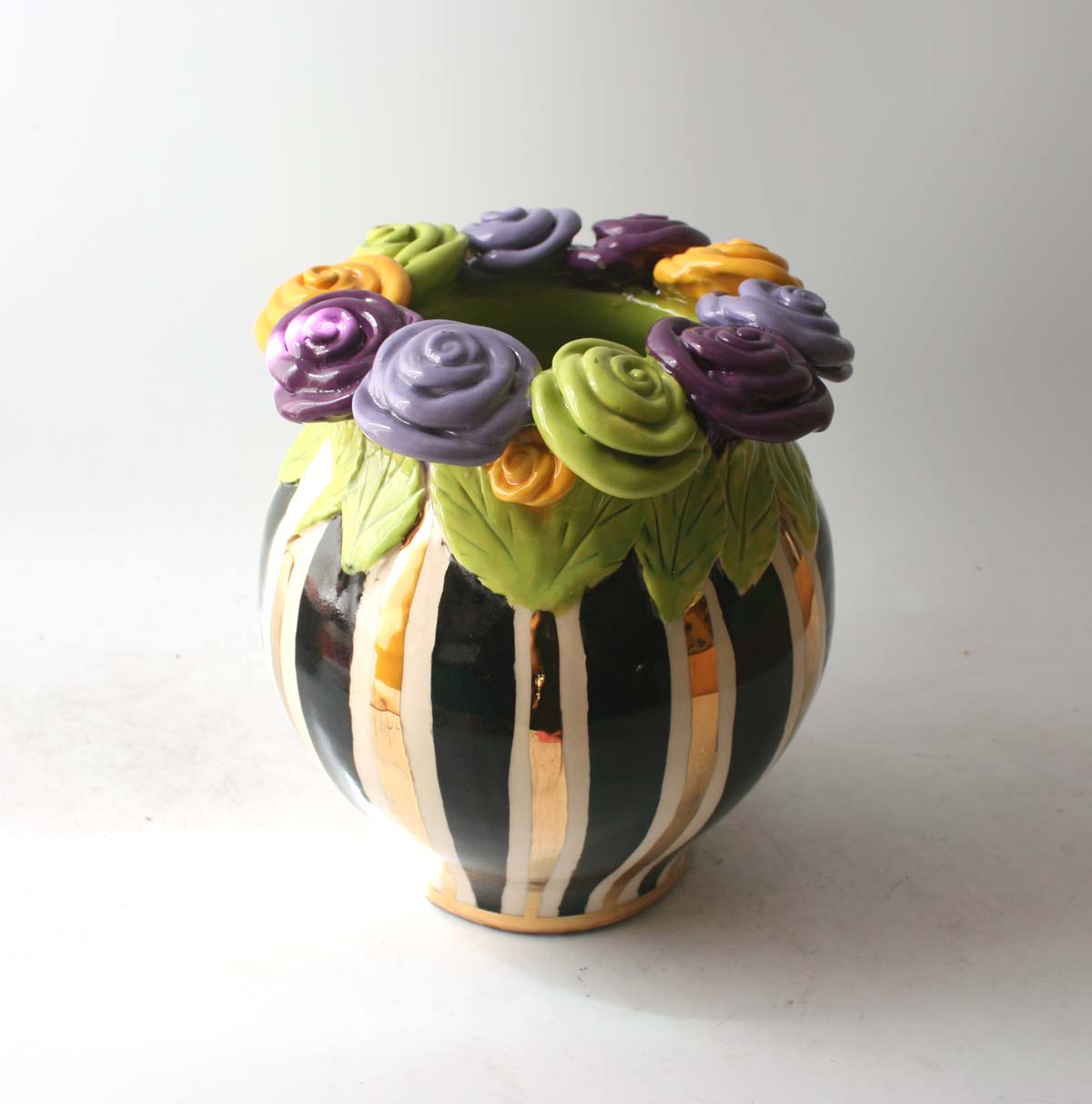 This Cauldron Vase stands around 8 inches tall, and is painted in Black and Gold and White Stripes...it has a ring of colourful ceramic roses around its rim which sit on a layer of green leaves, and the piece will be sure to catch the eye of whomever looks upon it!