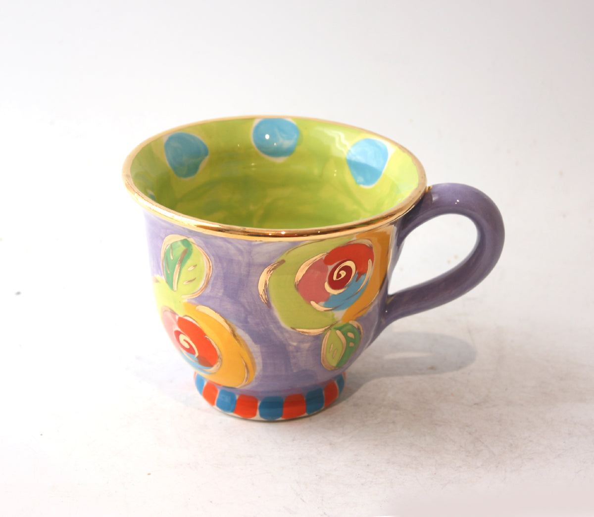This Classic Teacup stands just over 3 inches tall and is referred to as "Classic" as it carries the same shape as the ones Mary Rose's Grandmother used to use! The design is Gold New Rose on a purple background with a contrasting inside of "Daisy Dots"...
