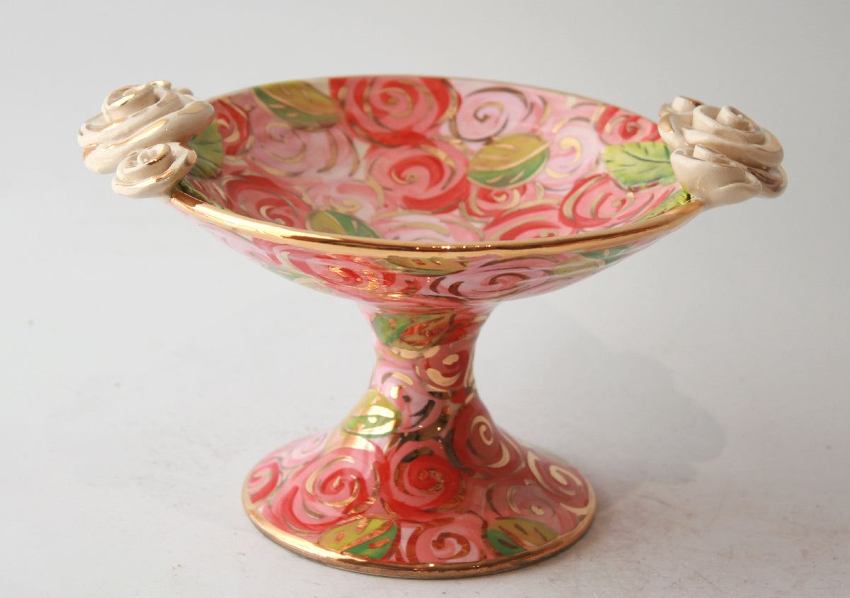 Mary Rose's Cocktail Dishes are charming little pedestal pieces perfect for any artefact from a candle to your car keys! Standing 5 inches tall with a 6 inch diameter, this one is painted in the very pretty "Pink Rosebush", with two clusters of ceramic roses on either side of its rim...