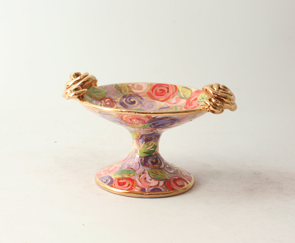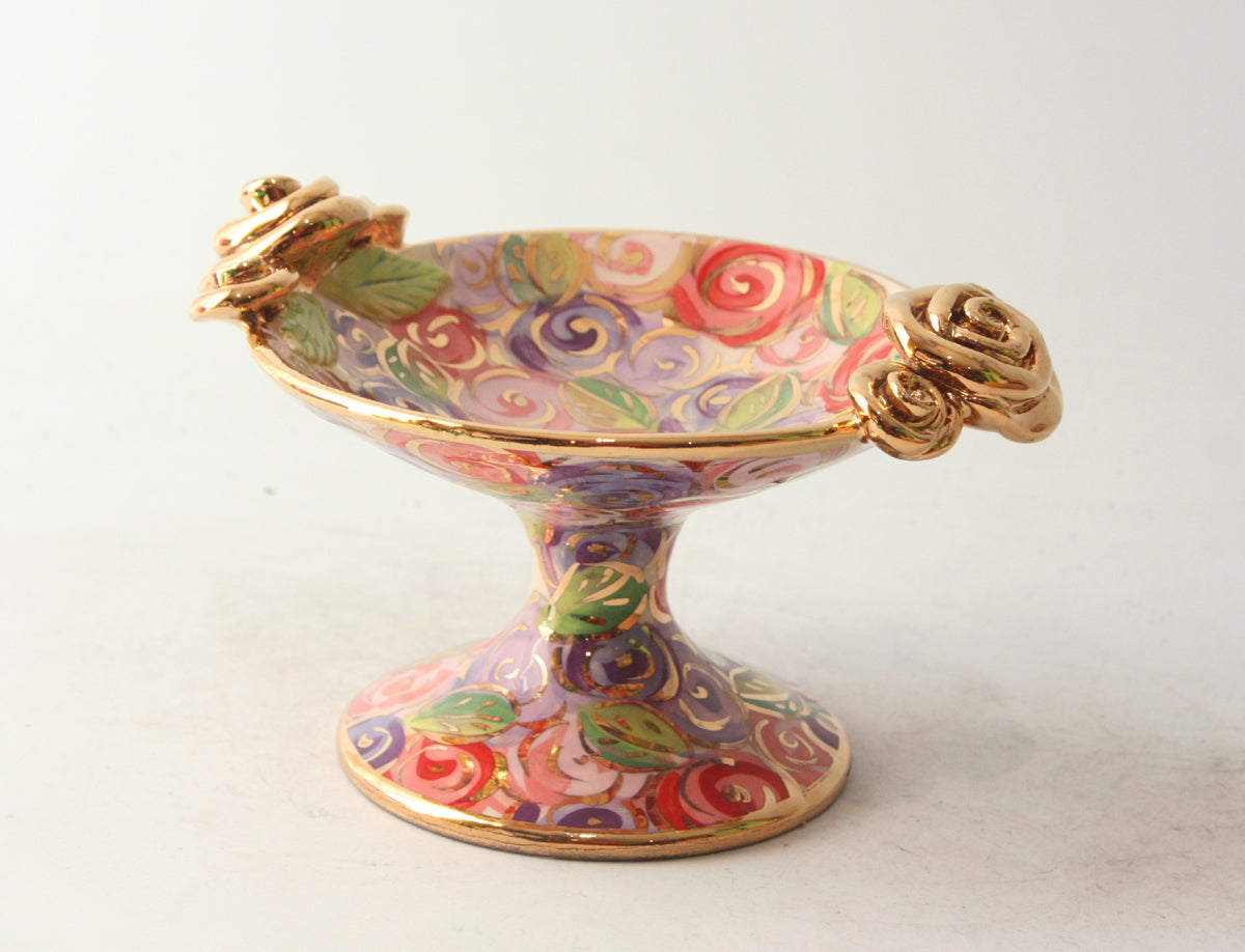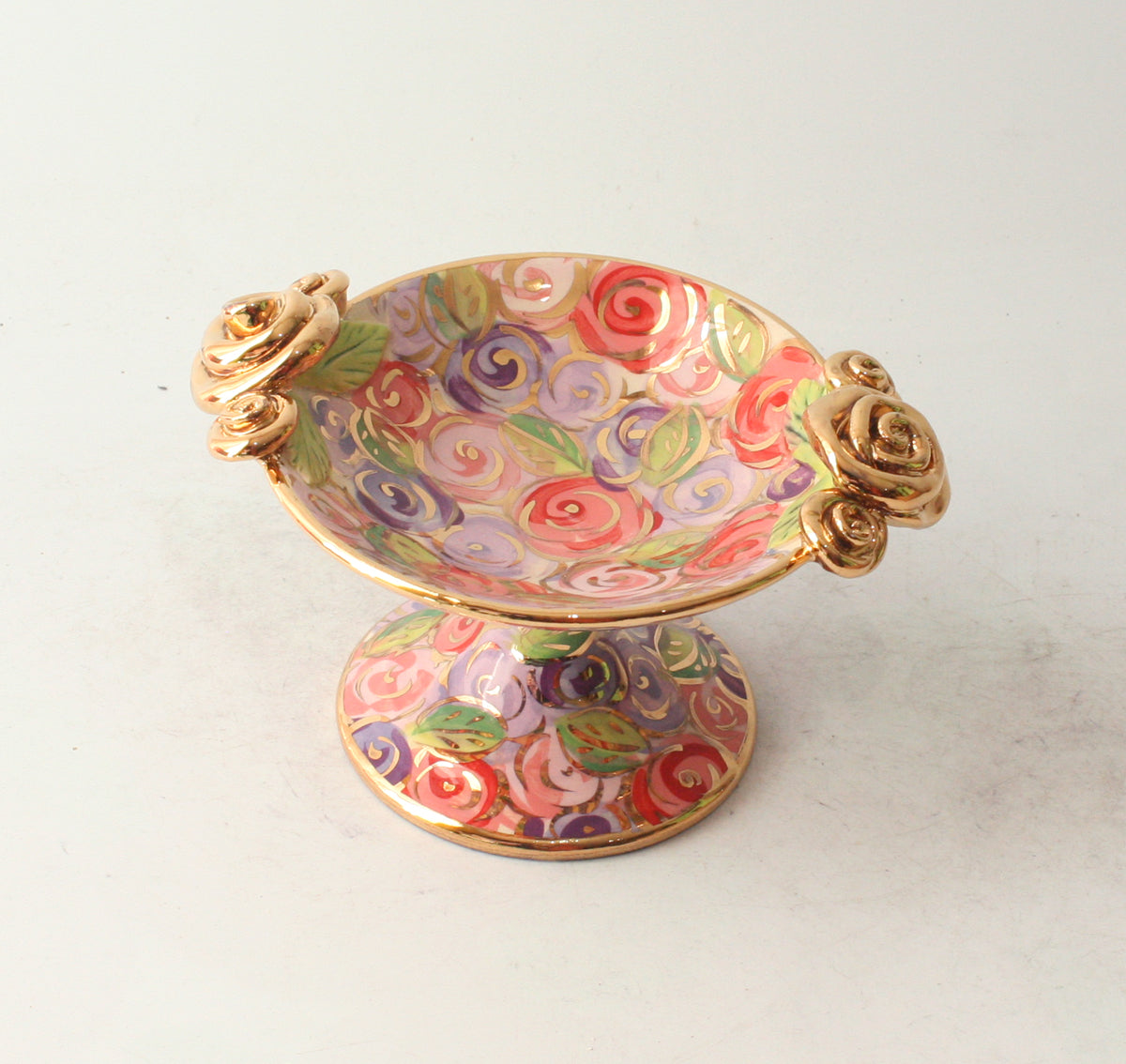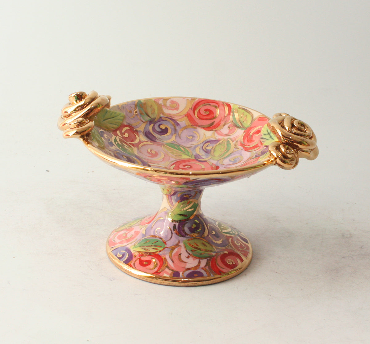 A Cocktail Dish stands around 5 inches in height and is a charming little pedestal piece for displaying any artefact you choose! This one is painted in a pretty Pink variation upon the classic "Rosebush" design with accents of 24 carat gold and two clusters of roses on either side of its rim...