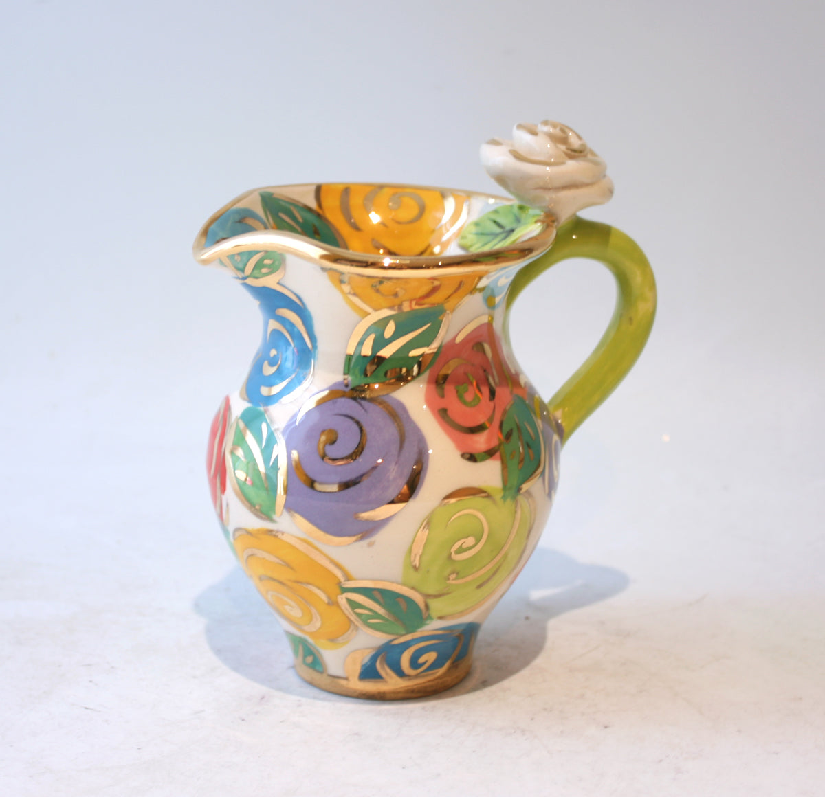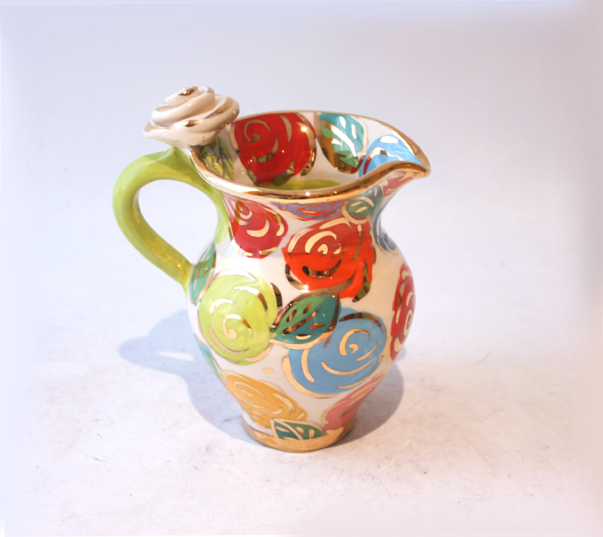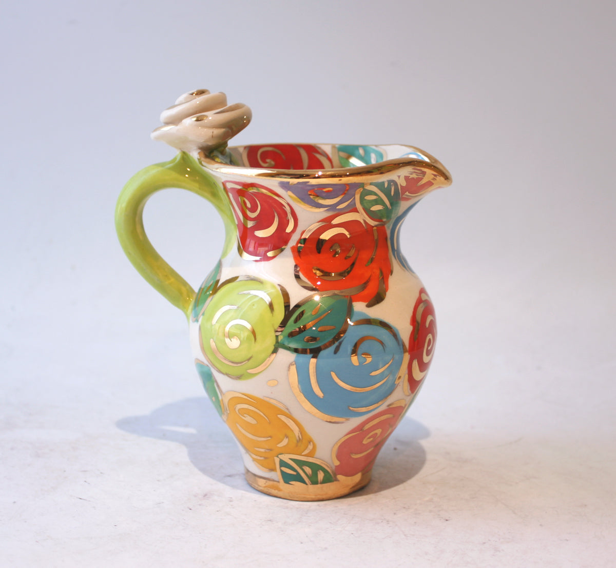 Creamer Jugs are designed to go with a Medium Teapot and Sugar Bowl, but at only 5 inches high they certainly have enough character to be individual pieces...with all the Mary Rose Young curves this one is painted in "Block Rose"