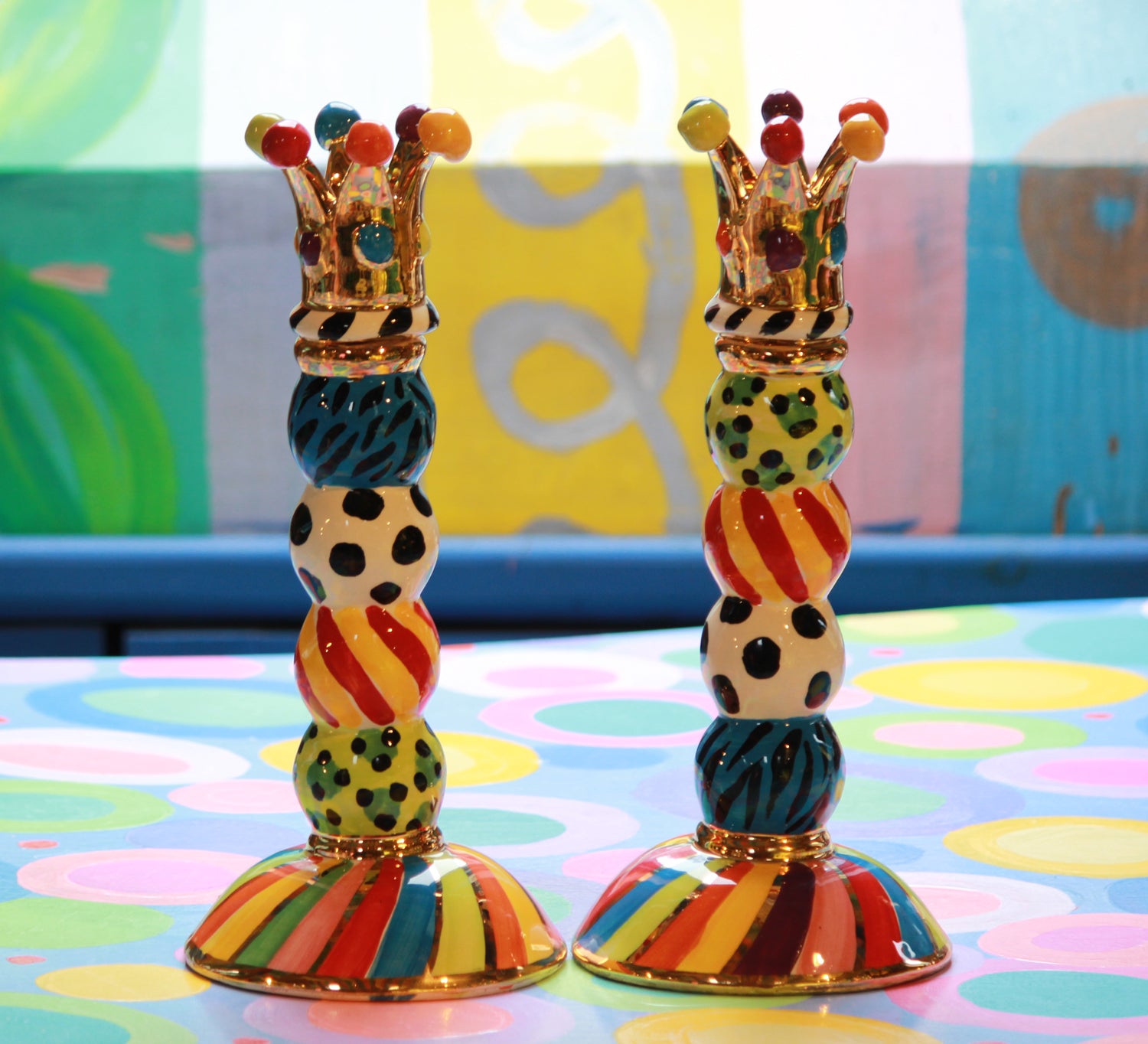 This magnificent Candleholder is a classical shape and concept, just like many of Mary Rose's pieces, but with her intense and joyous decoration it transcends into a completely unique zone... and quite takes your breath away. About 12 inches high, finished with 24 carat gold. The price is for a single candlestick