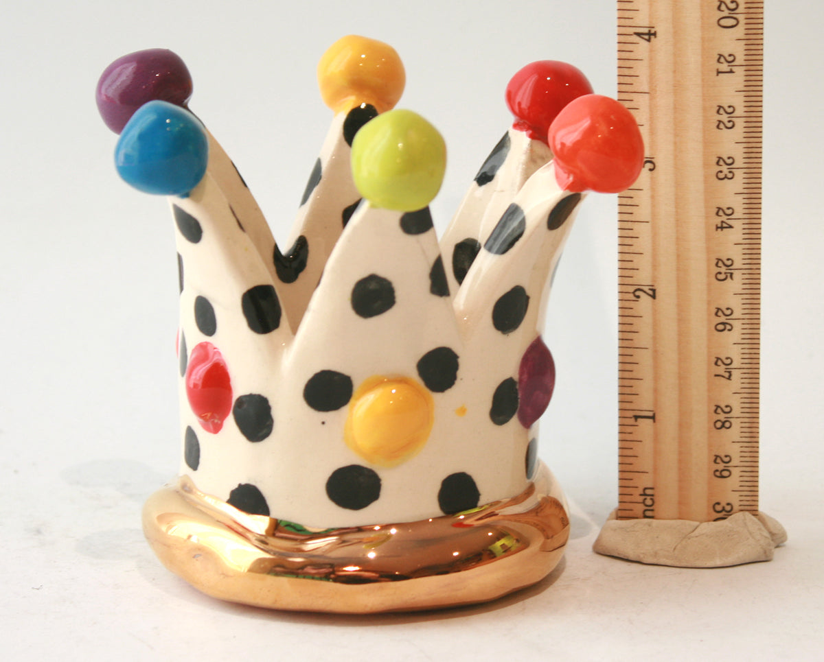 A handmade ceramic Crown that stands nearly 4 inches tall designed as a holder for a small candle or votive...painted in Black Polka with colourful beads with a 24 carat gold base