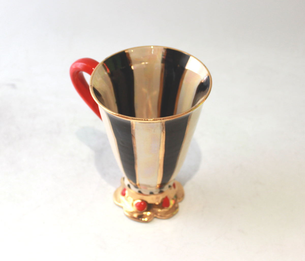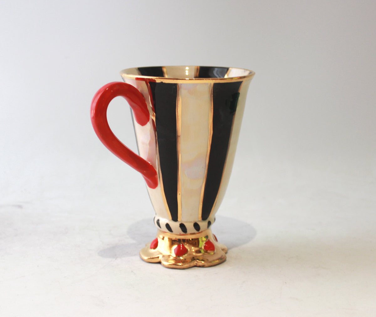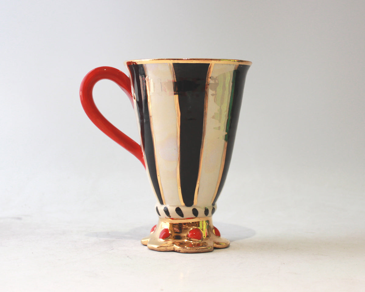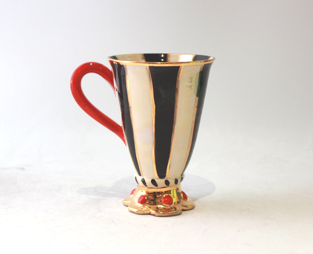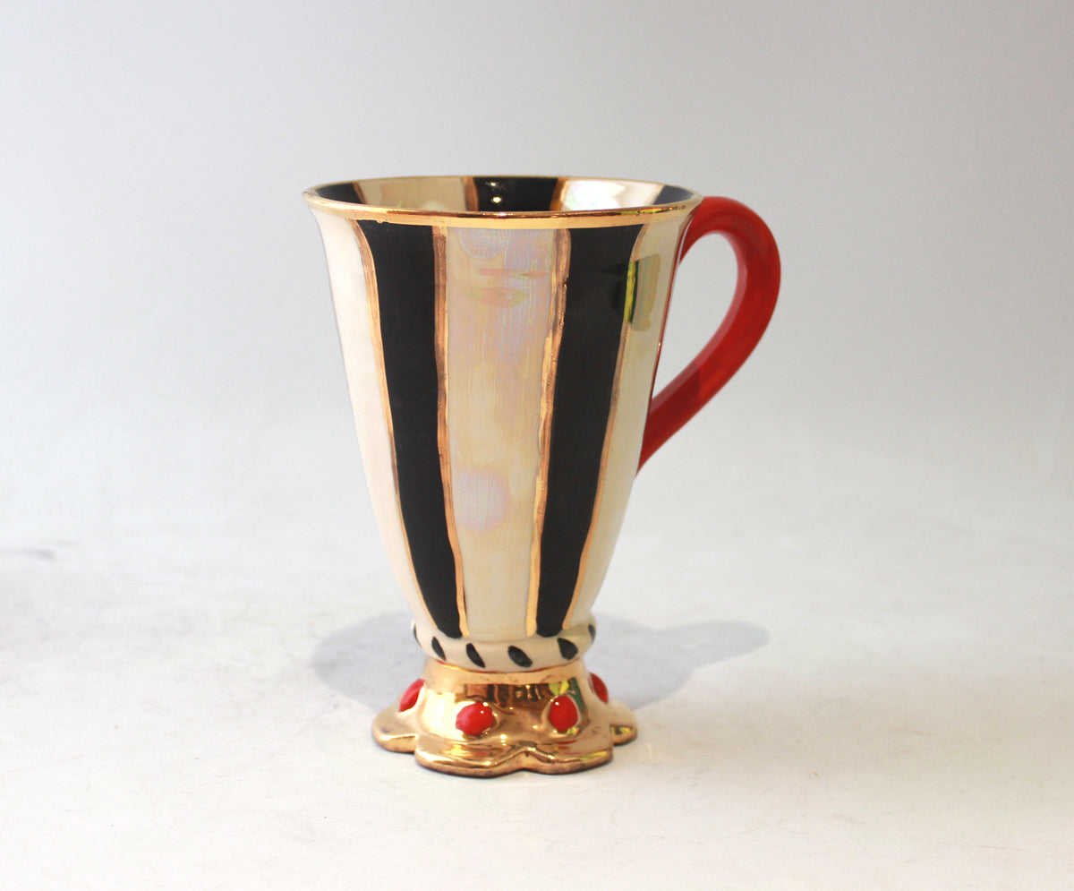 Mary Rose's Crown Footed Mugs are rather more rare variations upon her usual style; standing around 6 inches tall they sit upon a plinth which has been hand-shaped into a crown shape, this is then lavished in 24 carat gold and in this case, adorned with red "Jewels" for the most regal effect...this one is painted in "Black and White Stripe" on an iridescent Mother of Pearl background...