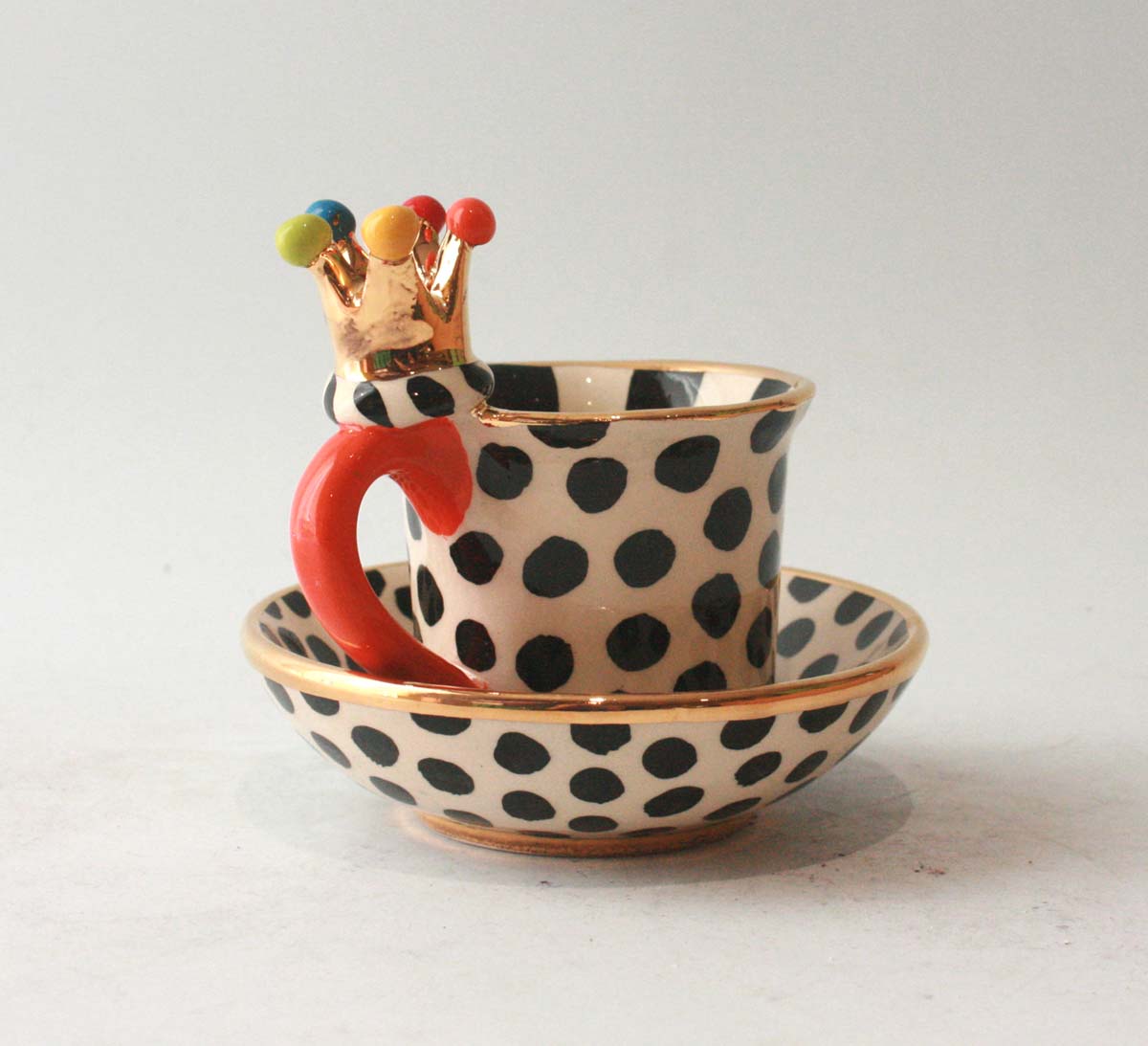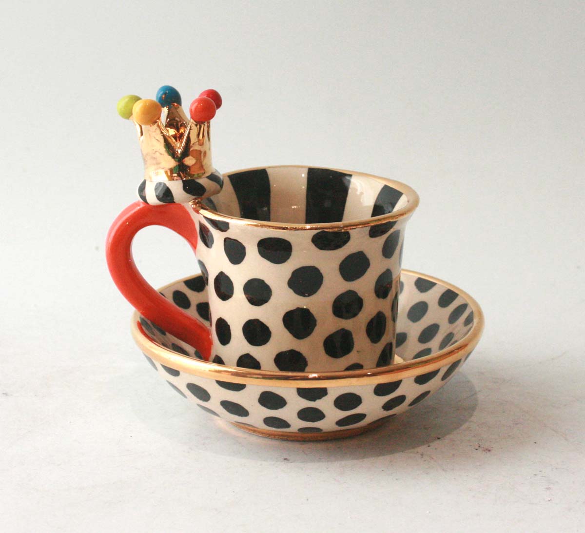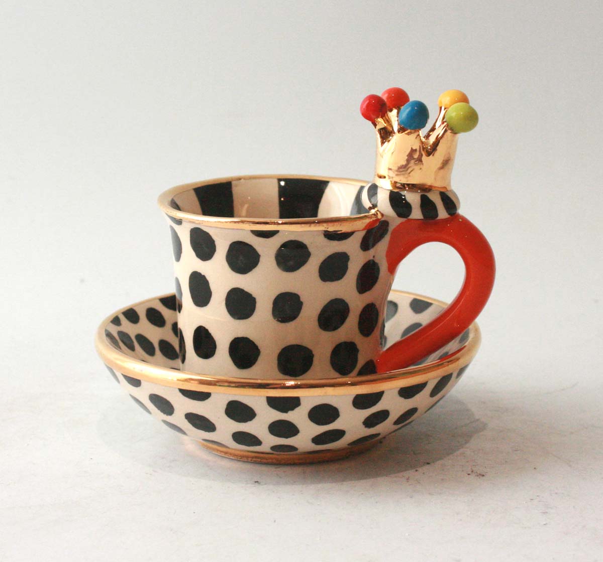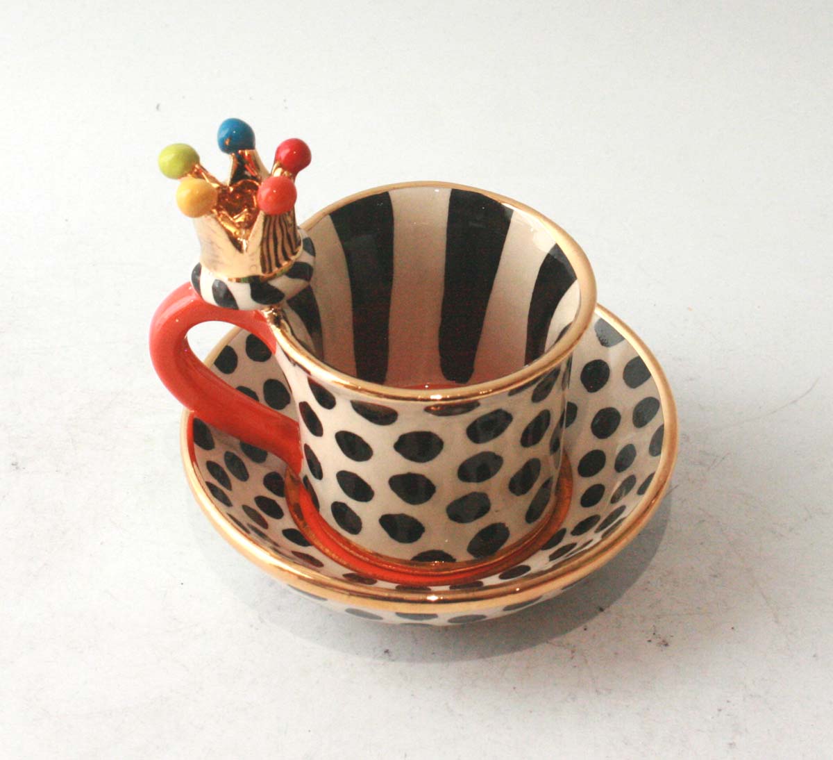 This little Cup and Saucer is the perfect size for your morning espresso...it stands around 3 inches tall and comes complete with a little ceramic gold crown atop its handle! The design is monochrome in "Black Point" on the outside, with a black and white striped inside and an eye-catching bright orange handle...